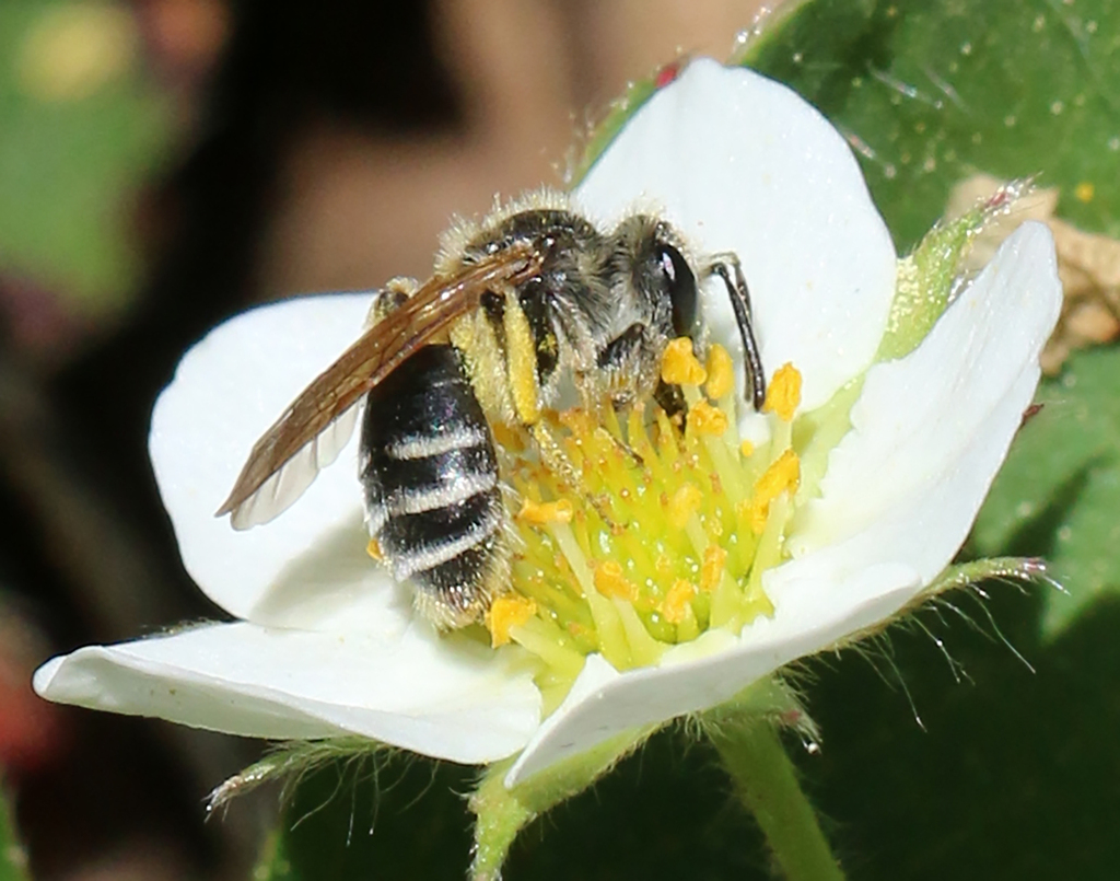 Today, the Virginia Strawberry is widespread and one of the most common flowers in spring. It’s known for being both a pollinator magnet and an important host plant for caterpillars—supporting hundreds of species across New England. We included Virginia Strawberry in our Native Plant Ecotype Experiment and have documented many visitors, including its specialist bee, the Rose Miner Bee (Andrena melanochroa).