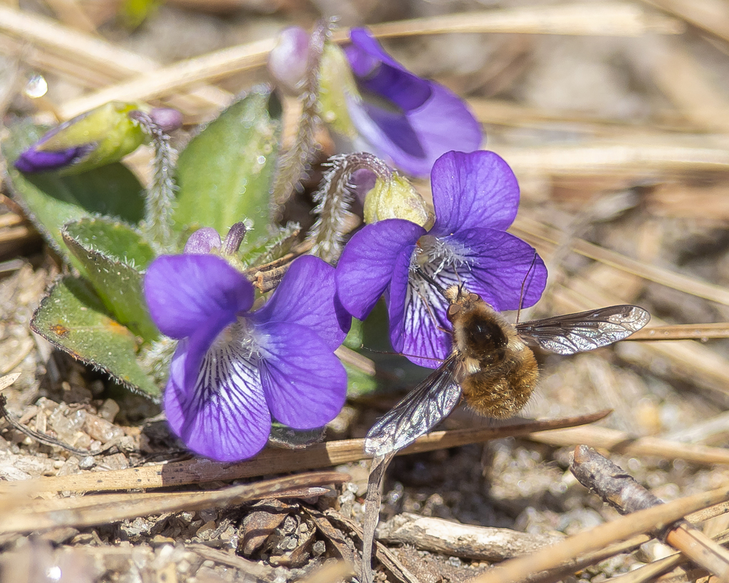 There are about 45 violet species native to Vermont and other parts of New England. They are the native cousins of the introduced pansies commonly found in nurseries each spring. Similar to monarchs and milkweed, violets are the sole host plants for most of our fritillary butterflies, like the Greater Spangled Fritillary. Violets are also visited by a pollen-specialist bee, the Violet Miner (Andrena violae), a rare (or at least rarely documented) species that flies early in the season. With so many violet species available, there is likely one that fits with the ecosystem where you live. One of my favorite violet species is the American Dog Violet (Viola labradorica). This dainty, lavender flower readily takes hold in lawns and gardens.