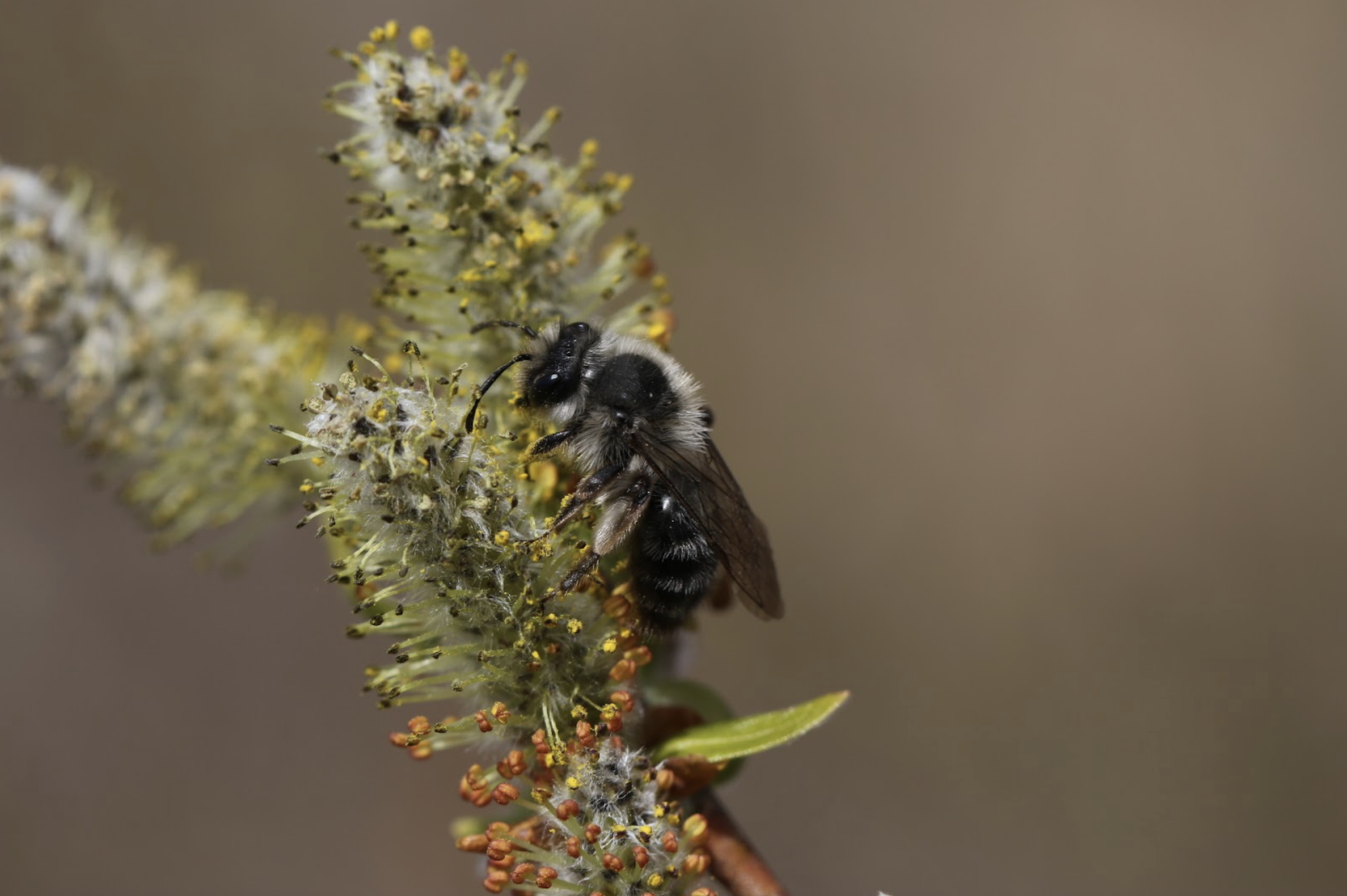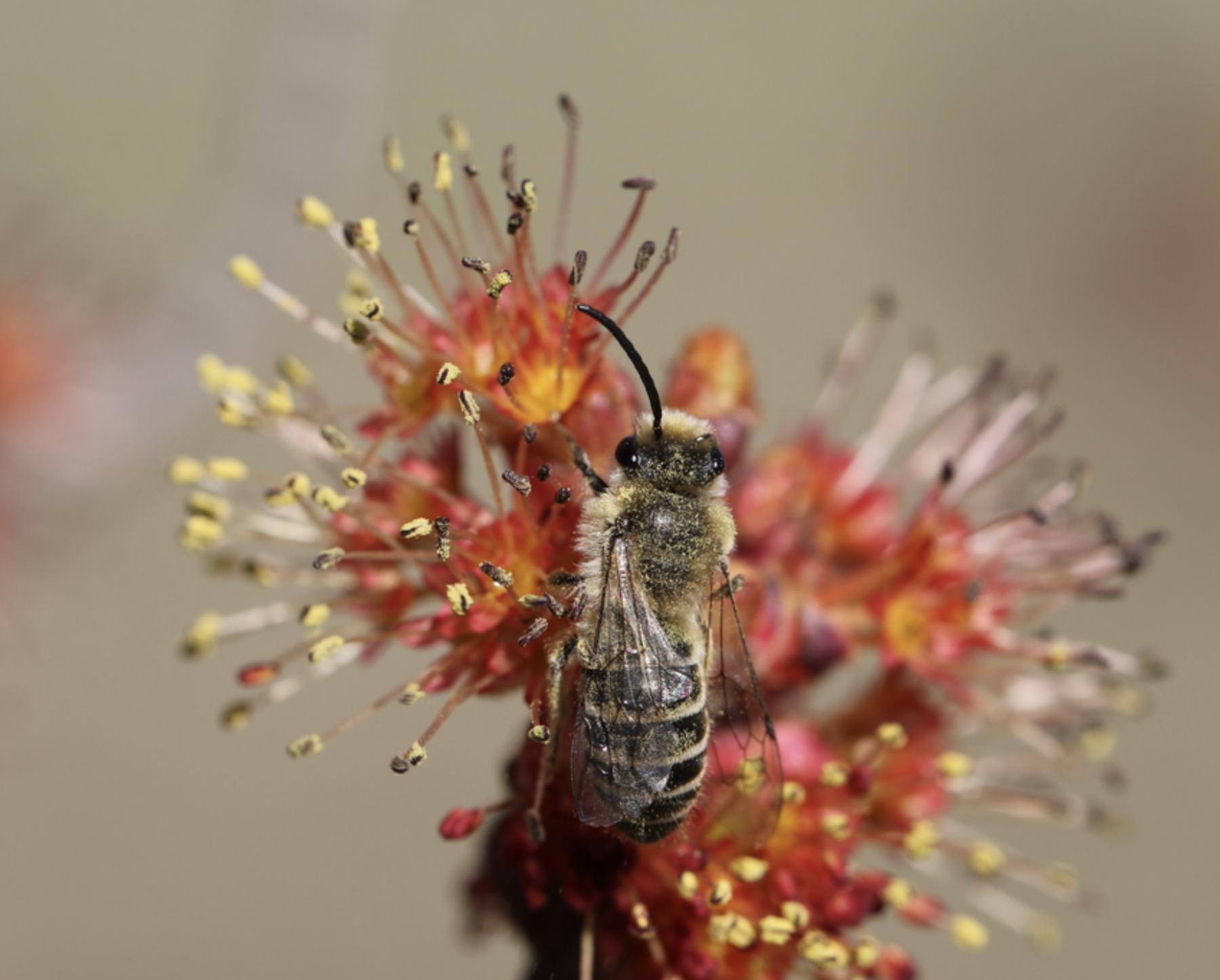 While these explosions of color can be witnessed at highway speeds, there is another whole layer of associated color and natural history that requires closer observation. With decent weather, all of these shrubs and trees are likely to be literally buzzing with potentially hundreds of insects, many of them wild bees. We know of nearly 60 species of mining bees that are likely to be active in May in Vermont. Twenty-four of them are specialists, the picky eaters of the bee world, only gathering pollen from a small subset of the available flowers. Within the shrub-associated mining bees, there are seven species that are dependent on willows, four that need dogwoods, and two associated with blueberries, plus a number of others that have a strong preference for flowering shrubs in general. And of course this explosion of flowers in the woods doesn’t go unnoticed by the less picky bees—watching bumble bee queens cruising a patch of willows has become a spring ritual for me.