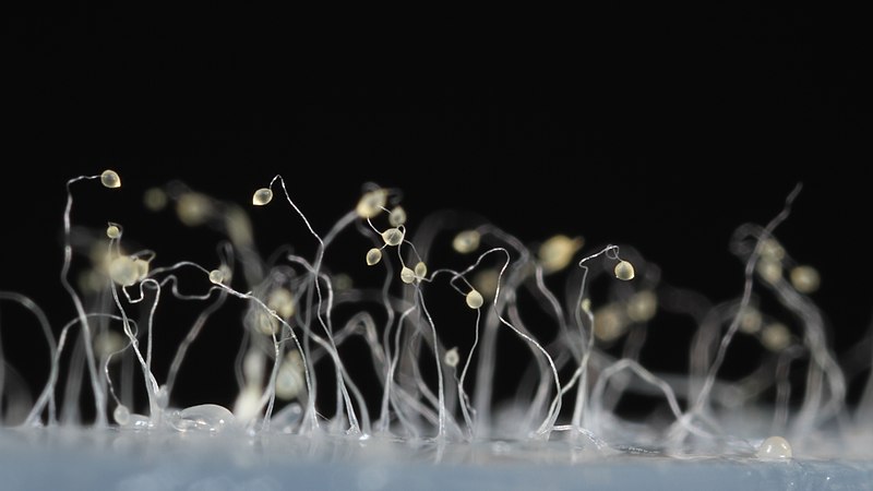 However, when conditions are unfavorable, Dictyostelium discoideum and other cellular slime molds form “slugs,” each containing a single nucleus. To reproduce, they crawl along the ground, leaving a trail of chemicals behind them. Other “slugs” of the same species find the trail and follow it, leaving behind their own chemical trace, making the chemical beacon stronger and thereby attracting more “slugs.” Once enough individual slime mold slugs have congregated, they fuse together to reproduce, with different individual slime slugs taking on different roles in the reproductive process, together forming a single stalked spore producing structure. Around one third of the individuals form the stalk and do not get to reproduce, dying in the process of spore structure formation. Through creation of a tall stalk, they collectively have a higher chance of survival since spores will be able to disperse farther, hopefully to more favorable conditions.
