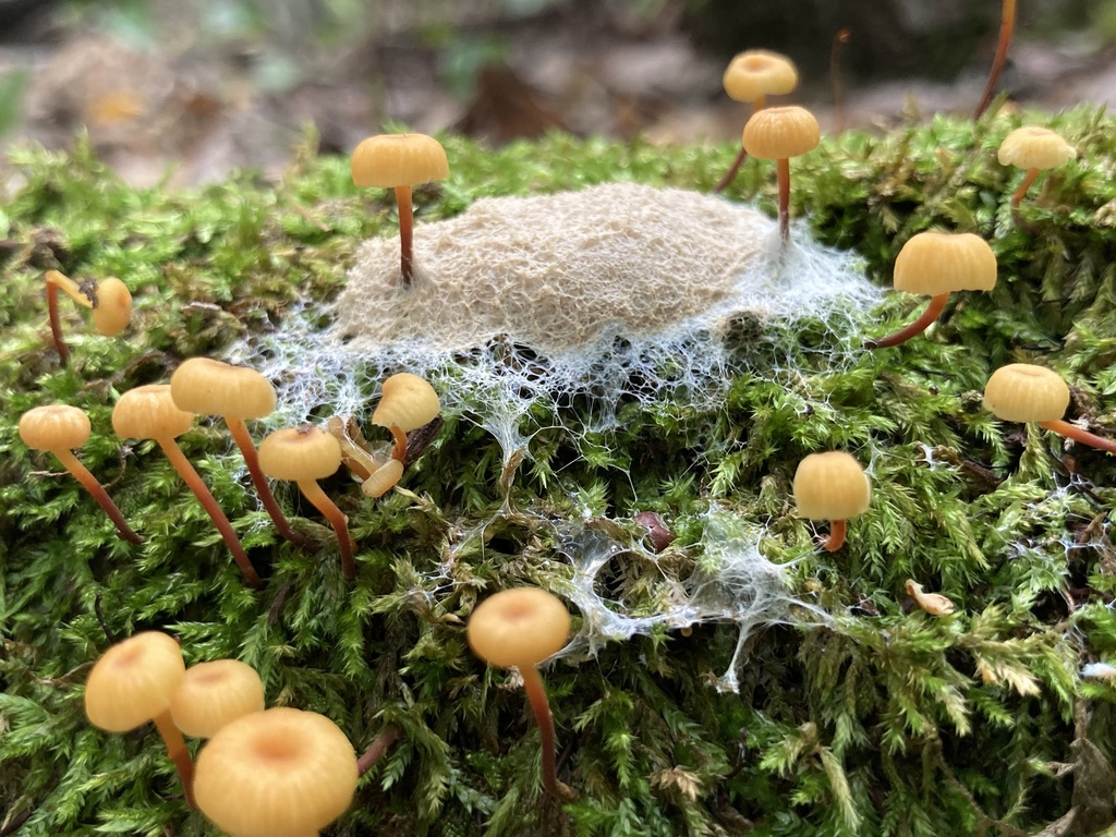 While strolling through the woods following some heavy rain, I stumbled across a mossy log covered in small mushrooms. I stopped to enjoy the diversity displayed on the decomposing log, and noticed someone who I had missed in my initial examination—a slime mold!