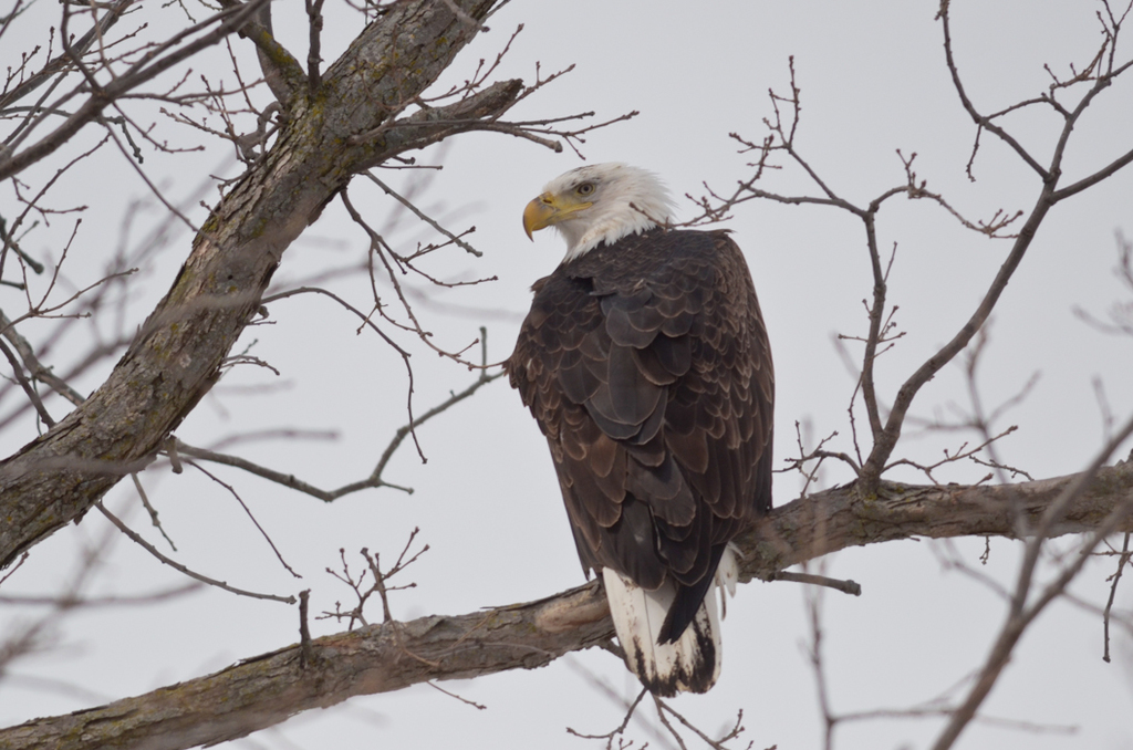 Young Bald Eagles are mottled brown in color, not developing the classic white head and tail feathers until around the time they become sexually mature, which is at 5 years of age. They mate for life, only taking a new mate if one of the pair dies. One fun fact is that Bald Eagles use the same nest for many years, adding to it every breeding season. Nests have been recorded to be 10 feet in diameter and can weigh several tons!