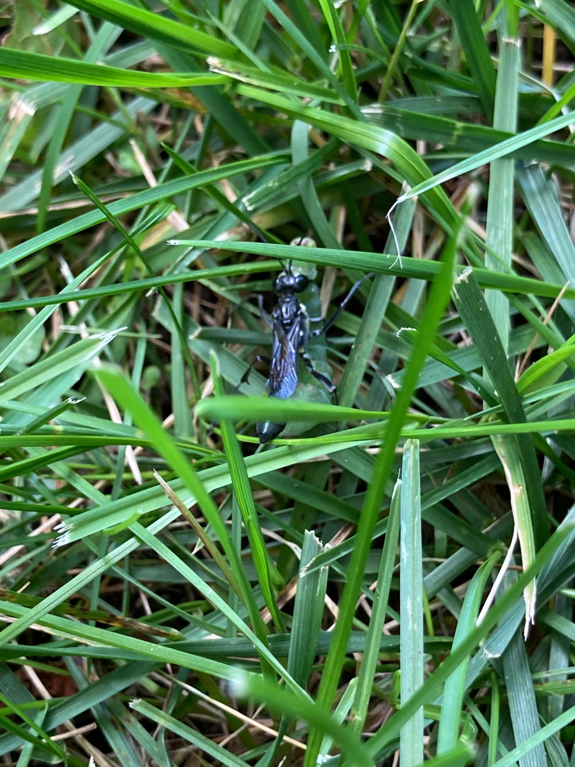 Great Golden Digger Wasps (Sphex ichneumoneus) hunt for grasshoppers, katydids or crickets. With a sting, they paralyze their prey, place it in an underground chamber, and lay one egg on it. The victim stays alive, providing fresh food for the hatching larva to feed upon. House Sparrows (Passer domesticus) and American Robins (Turdus migratorius) have been observed chasing wasps carrying prey to their nests, causing them to drop the food, which the birds then grabbed and ate. The wasps produce one generation per year. The young wasps spend the winter in their nests and emerge the following summer.