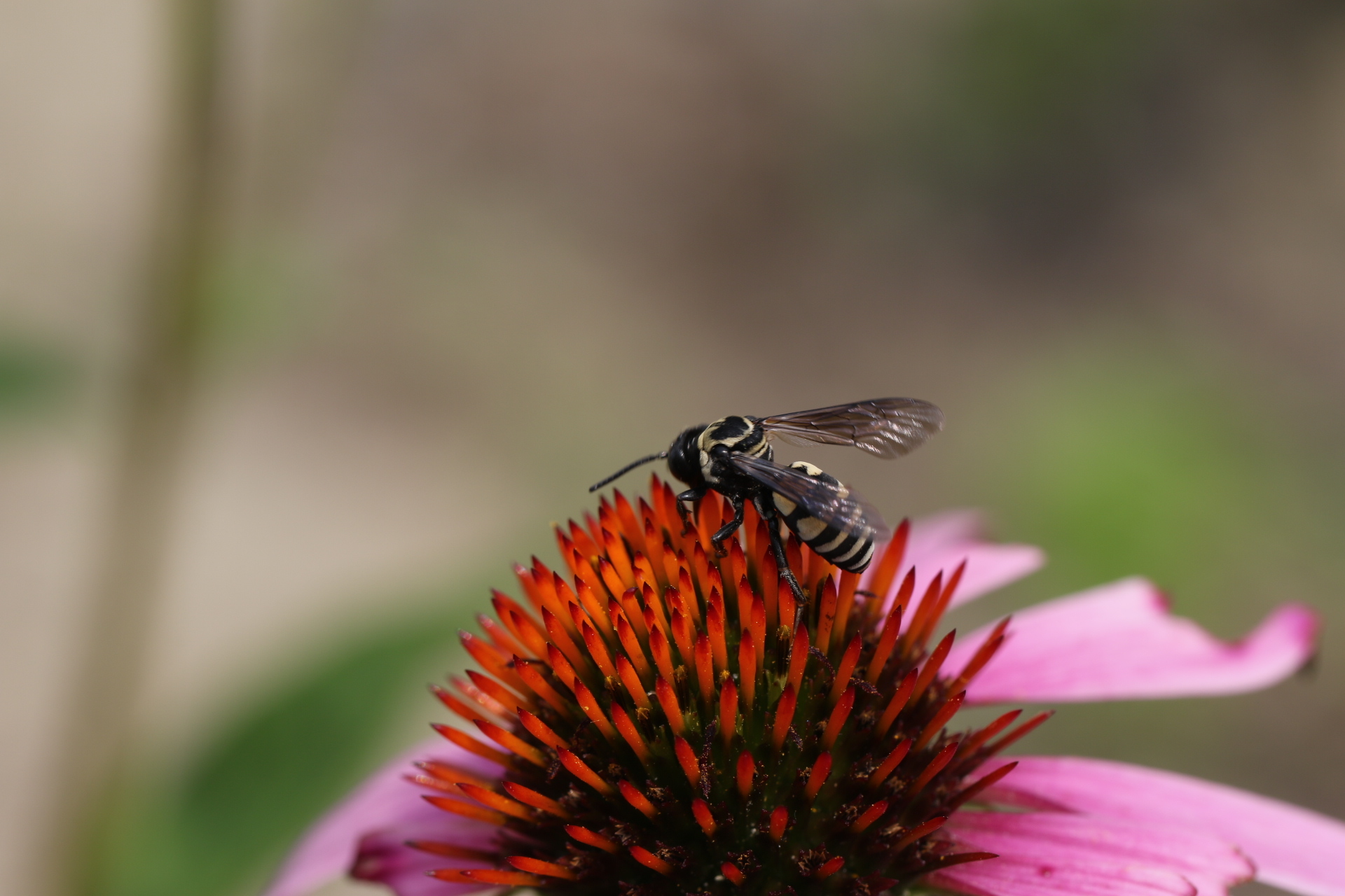 This wasp inhabits old fields near deciduous woodlands, and can commonly be found on wild flowers that have “large clusters of blooms, such as Queen Anne’s Lace” (BugGuide.net). As adults, they primarily eat nectar, but may also prey on small insects that they catch in the air. Gold-marked Thread-waisted Wasps seem to be most commonly found between July and August, so keep an eye out for these fascinating insects this August!