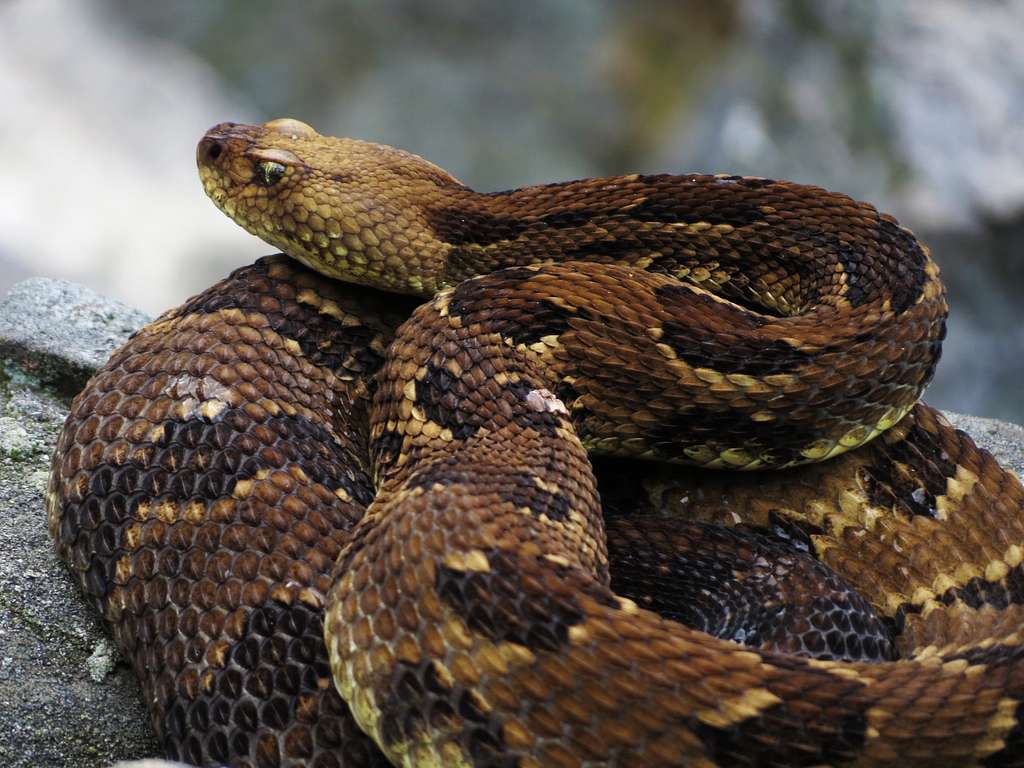 Although these snakes are venomous, Timber Rattlesnakes are not aggressive and do everything they can to avoid humans. Even when threatened to the point of biting, they usually employ “dry” bites, meaning they do not inject venom. Timber Rattlesnakes can choose whether or not to utilize venom when they bite and individually push out or retract their fangs. While it is unwise to attempt handling one of these snakes, they are not a “horrid” species to be feared, as their scientific name C. horridus, suggests.