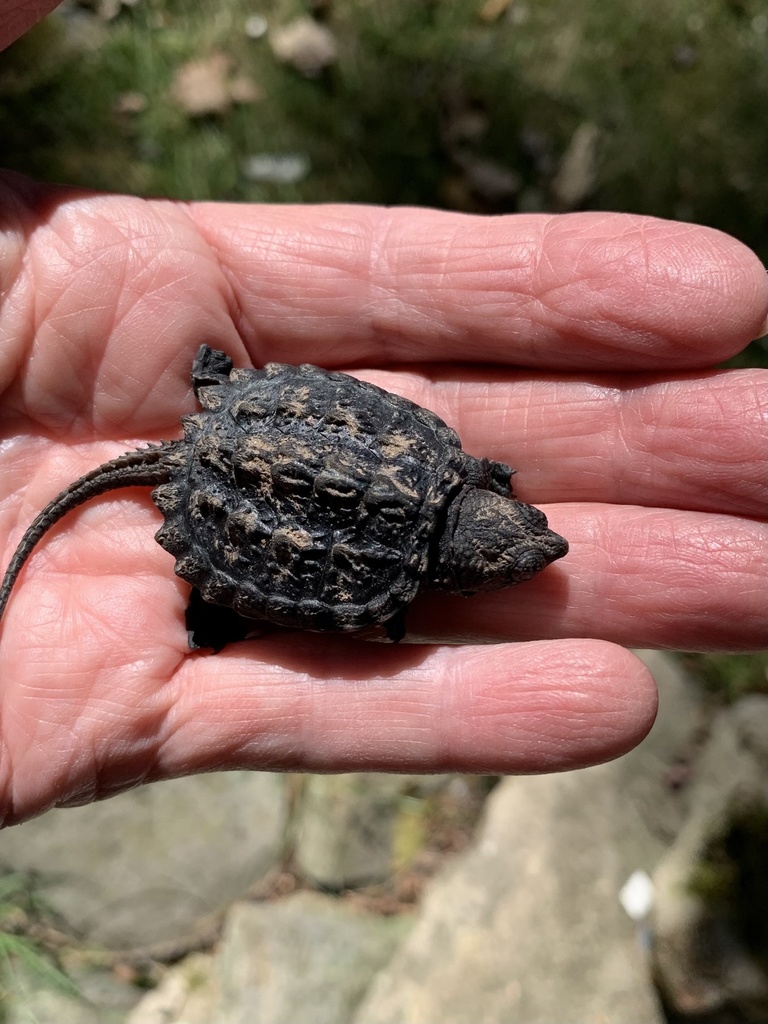 Like Spiny Softshells, Snapping Turtle (Chelydra serpentina) young also begin to hatch in August. Their nesting season lasts from April through November, but most egg clutches in New England are laid between May and June. Snapping Turtles have temperature-dependent sex determination, meaning the temperature of incubation determines whether the offspring are male or female. Eggs incubated at 68 degrees Fahrenheit yield females, those incubated between 70 and 72 degrees Fahrenheit yield both sexes, and those incubated at 73 – 75 degrees Fahrenheit produce only males.