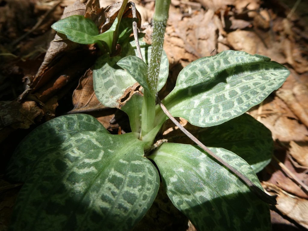 This evergreen plant is not a plantain but an orchid species. Found in the moist upland soils of coniferous and deciduous forests, this plant has dark green, pubescent leaves with white veins. The leaves grow in a basal rosette, meaning they only grow at the base of the plant from the central stem and surround the center point to form an overlapping circle of leaves. Their flowers are small and white, clustered around the top portion of the stem.