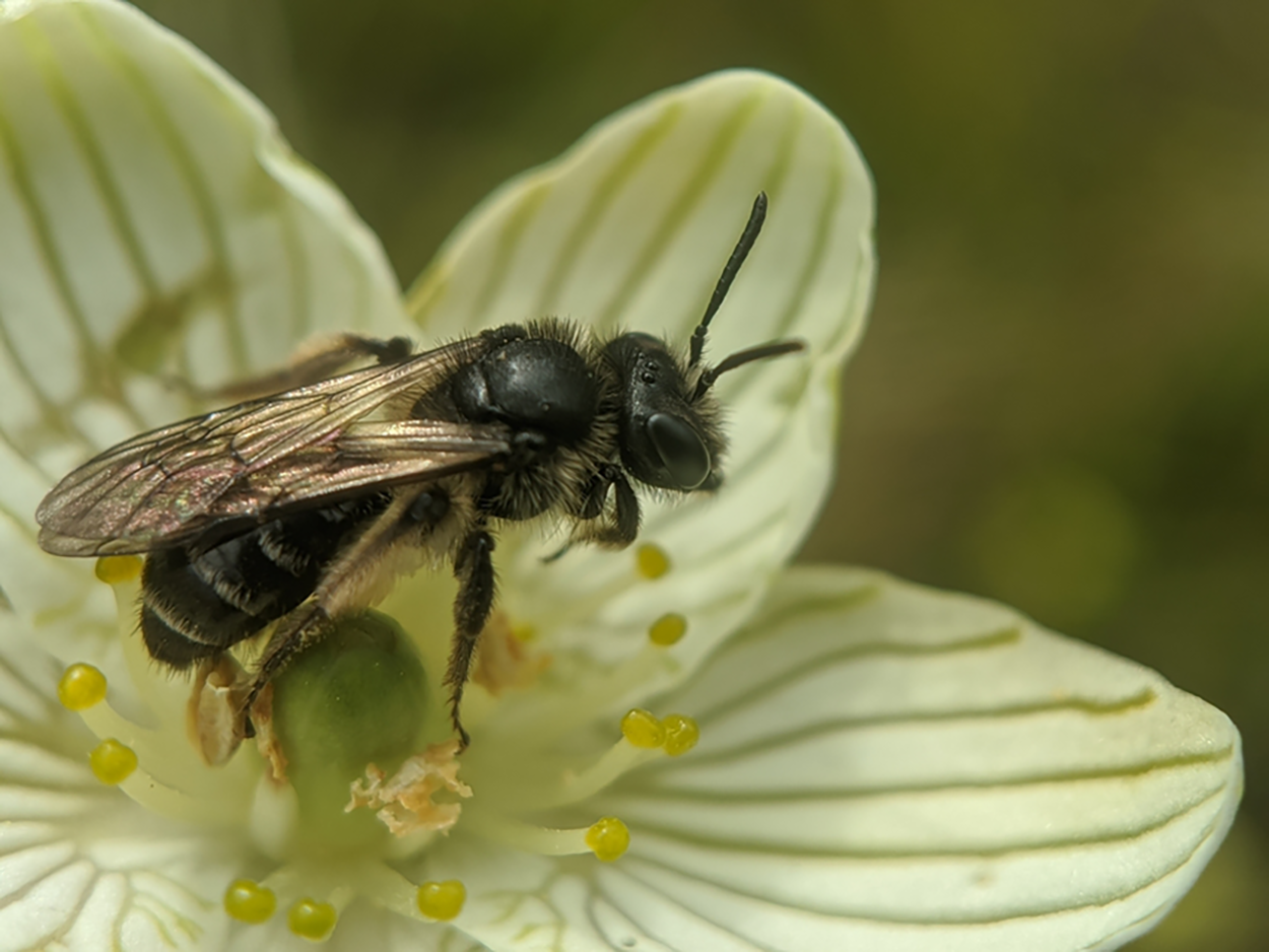 August brings an explosion of goldenrods, asters, and sunflowers—each with a unique suite of specialist bees. However, one bee is about to emerge that will completely ignore all these tall and showy flowers. Instead, the Parnassia Miner (Andrena parnassiae) is singularly focused on a small, white flower growing in certain fens and a few rocky floodplains. Fen Grass of Parnassus (Parnassia glauca) is limited to alkaline soils and seems to do best with regular disturbances like flooding, grazing, and even mowing. It is threatened by development, invasive species, and nutrification. While its host plant is absent from large portions of the state, Vermont may be one of the major strongholds for this bee, a species that remained largely a mystery until the last decade. Recent work has shown serious threats to the flower, and we still have much to learn about the distribution, natural history, and conservation of what may someday become an iconic Vermont species. Read more about both the flower and the bee on Bryan Pfeiffer’s blog.