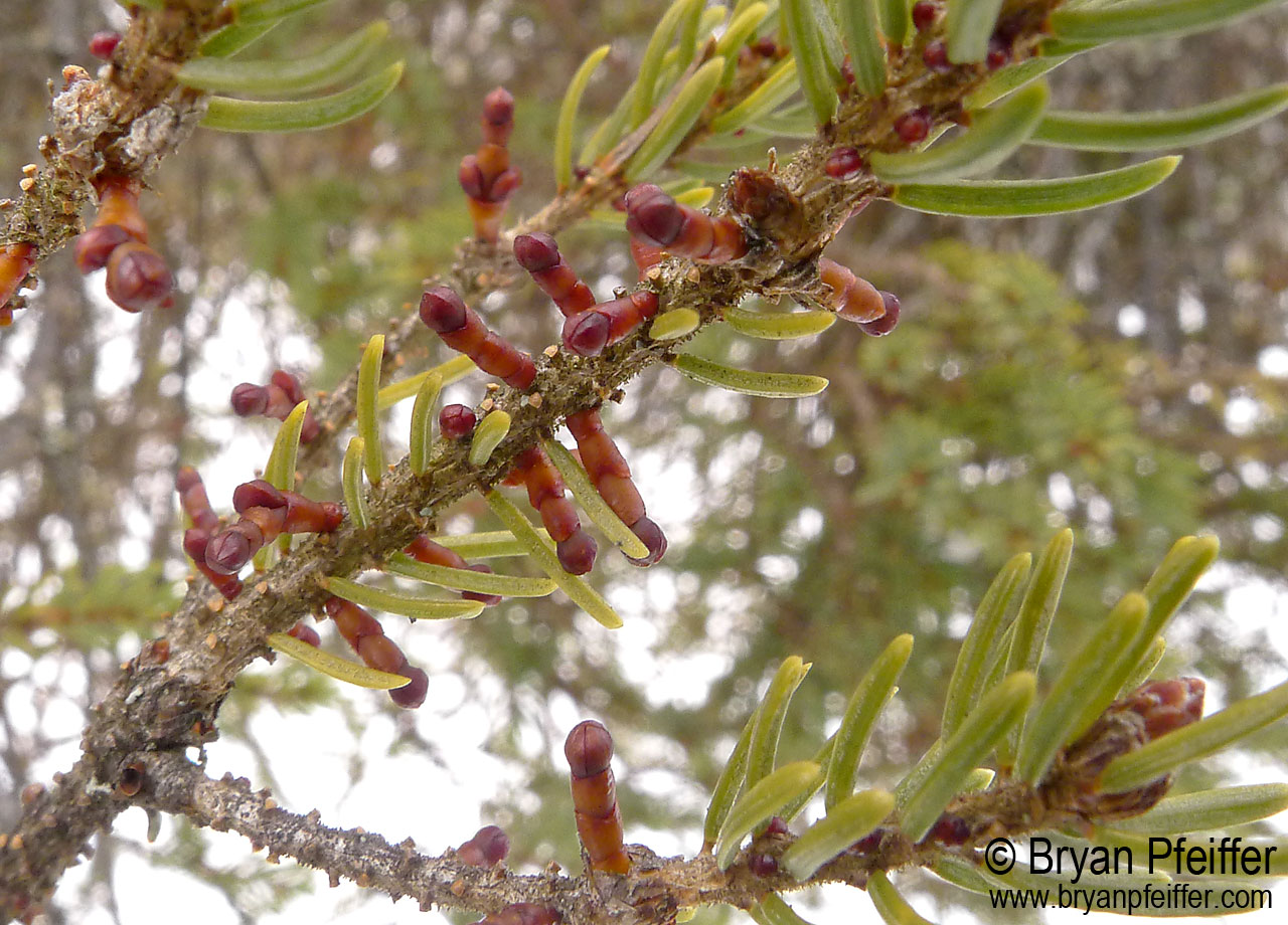 Like other mistletoes, Dwarf Mistletoe (Arceuthobium pusillum) is a bit of a thief, actually a hemiparasite, which means it steals minerals and fluids from its host plant, and also generates some of its own energy through photosynthesis. It grows within the branches of pine, spruce, fir, or tamarack, sometimes causing unusual growths of twigs on the host, called witches brooms.