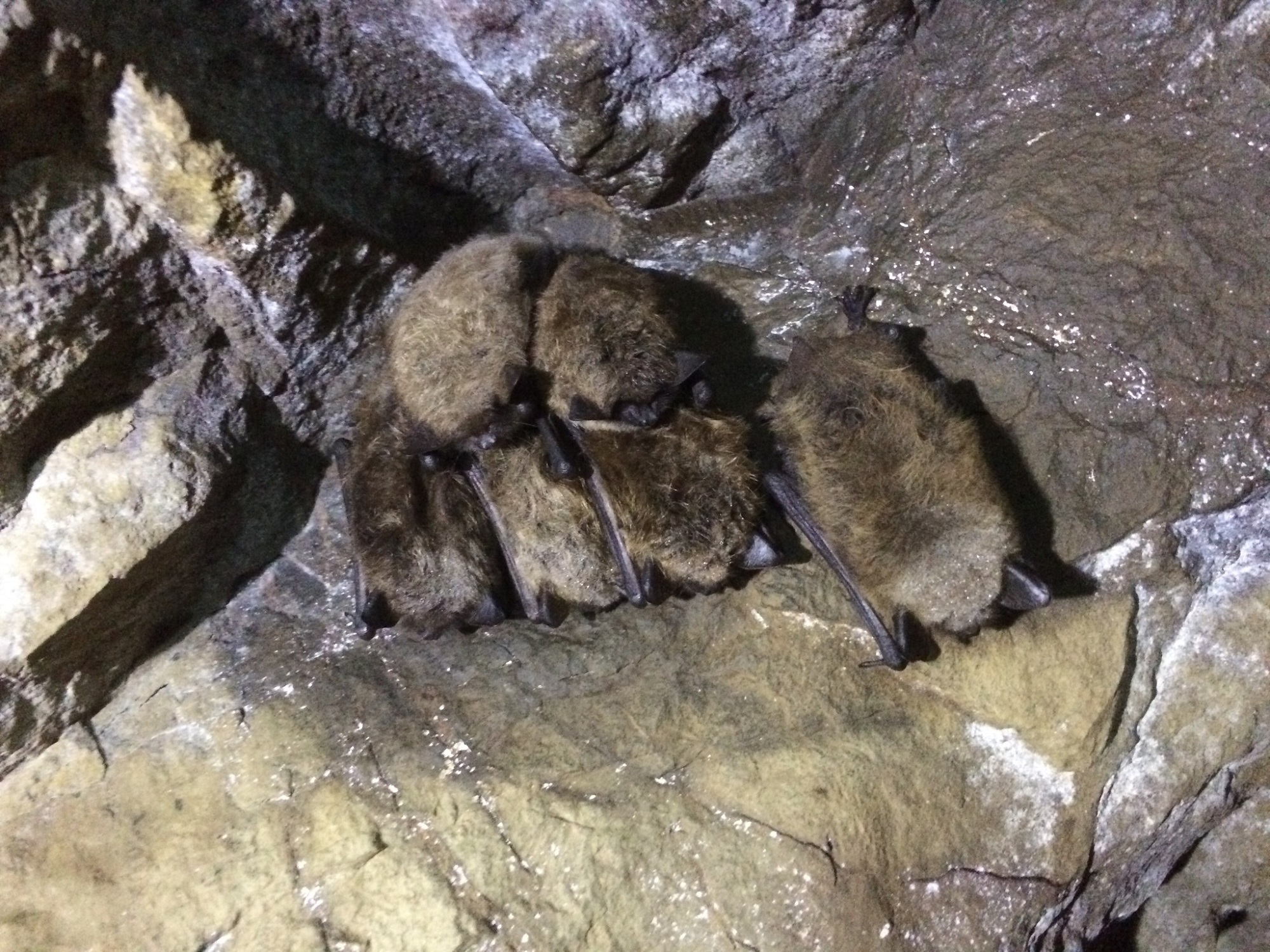 This type of hibernation is not unique to bats – other small mammals that remain in Vermont all winter long fall into a similar state. However, for Vermont’s hibernating bat species, it carries an extra risk. Over the past decade, white-nose syndrome (WNS) has plagued bat populations. Pseudogymnoascus destructans, the fungus responsible for WNS, loves cold, damp places, making hibernacula the ideal locations for it to grow and spread. And hibernating bats, whose immune systems get suppressed during torpor, make it easy for the fungus to proliferate. Once introduced to its host, P. destructans invades skin tissue, causing the characteristic white fuzz on both snout and wings. Infected bats also experience increased water loss, frequent arousal from hibernation, and greater depletion of fat reserves. Ultimately, these conditions weaken infected bats, making many cases fatal.