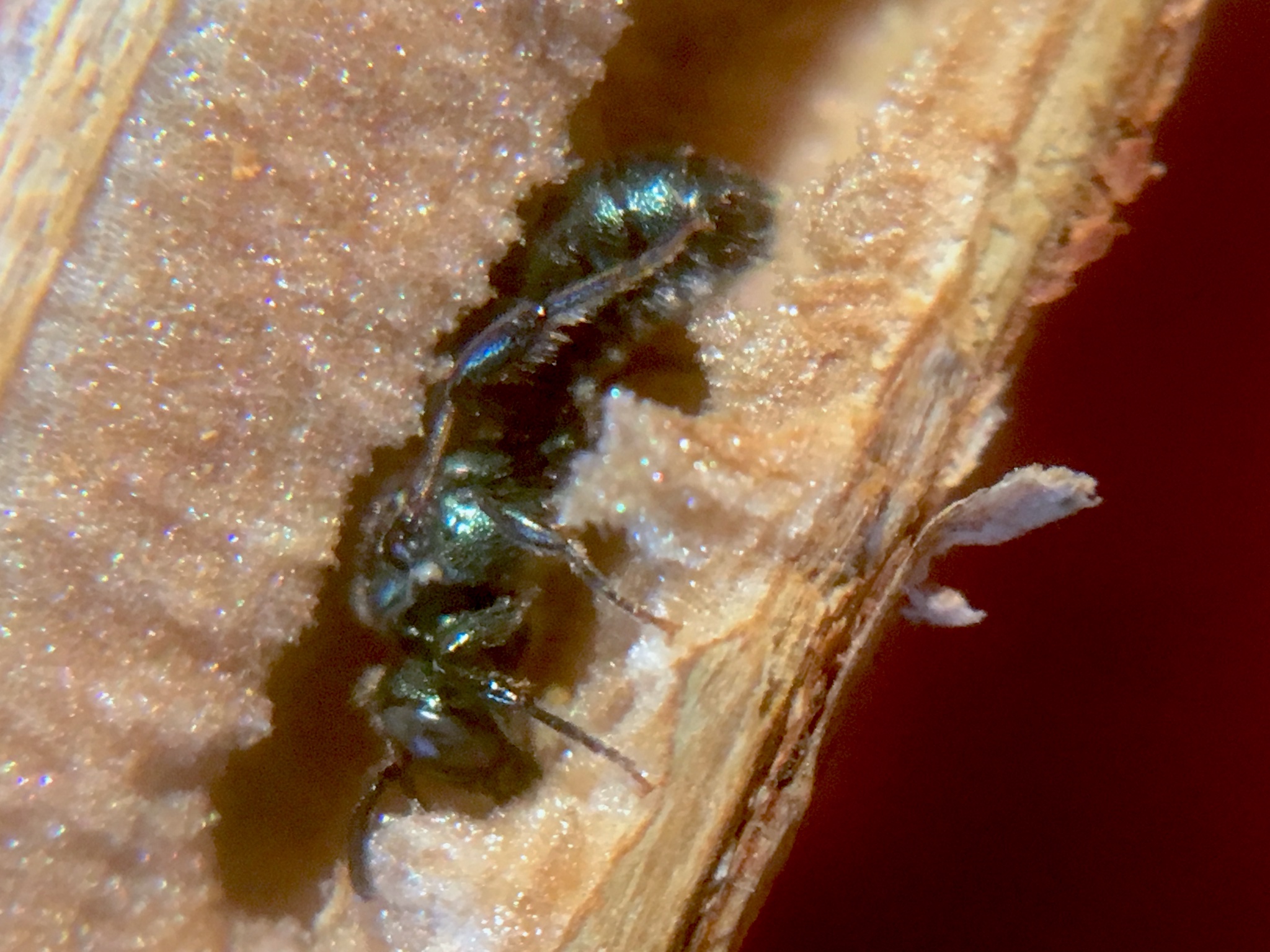 We know much less about the overwintering strategies of most of the solitary bees, yet there is at least one group that can be found relatively easily during the winter months. If you have raspberries or blackberries in your yard, check any medium to large canes that have been broken off or previously cut. You will likely notice that in the center of many such canes there is a hole in the top where the pith has been removed. This is likely the work of a small carpenter bee (Ceratina sp.) which may be the most abundant bee genus in the state. Where the pith once was there could be several adult Ceratina patiently awaiting the arrival of warmer temperatures. Researchers at University of New Hampshire and Iowa State University found that these bees change their gene expression in preparation for a long, cold winter by producing proteins related to fat storage while reducing transcriptional activity related to cellular and muscular structure processes. Having enough fat stored to slowly burn over the winter as they sit tight is the key for their survival.