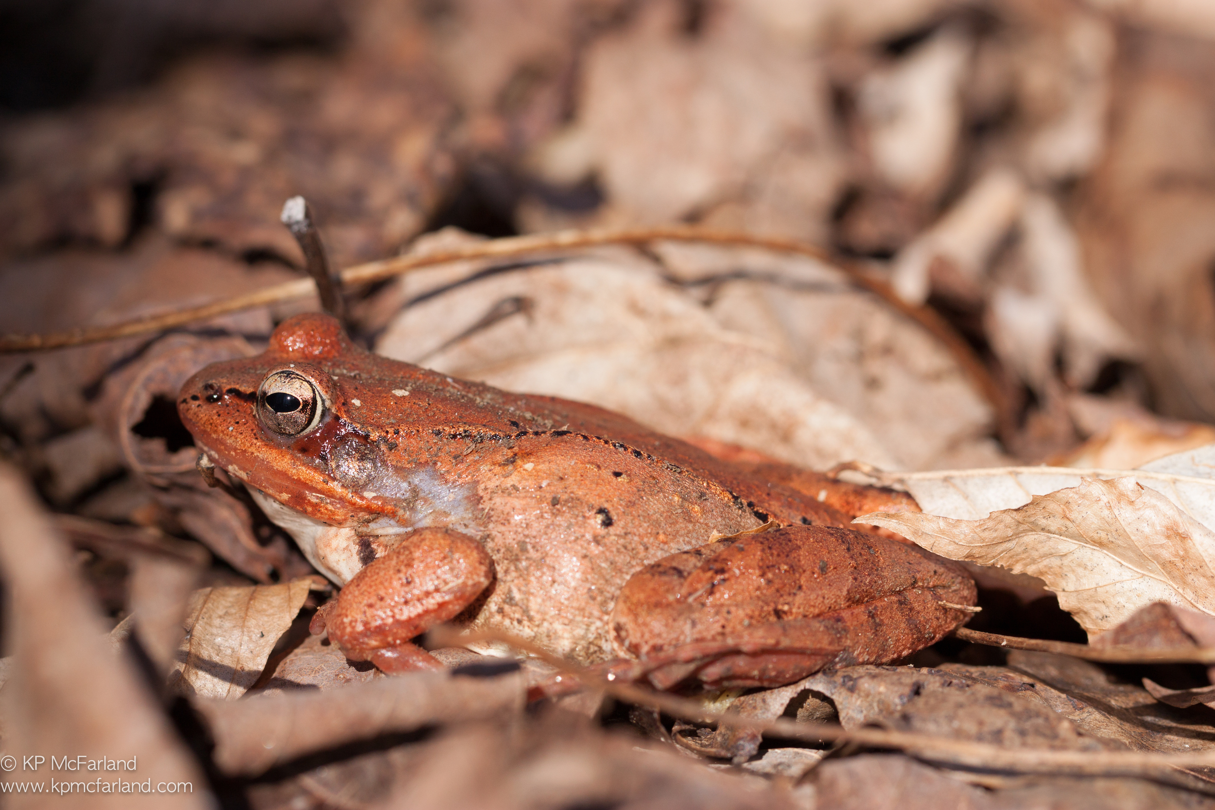 In late autumn ice began to form inside the bodies of Wood Frogs. Glucose levels increase in their blood by as much as 200-fold in just eight hours, creating an antifreeze that preserved their tissues and organs through the long winter. The ice penetrated throughout their abdominal cavity encasing all the internal organs. Large flat ice crystals formed between the layers of skin and muscle, and frozen lenses made their eyes white like zombies. Their blood stopped flowing. As much as 65% of the frog’s total body water was locked in ice. Breathing, heartbeat, and muscle movements all stopped. The frozen frogs are in a virtual state of suspended animation. They’re nearly-dead.