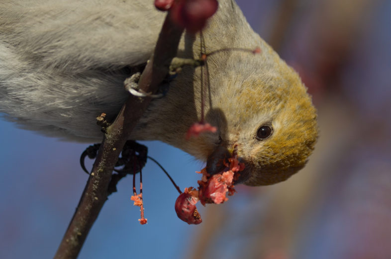 Pine Grosbeak feeding on crabapples © Nathaniel Sharp