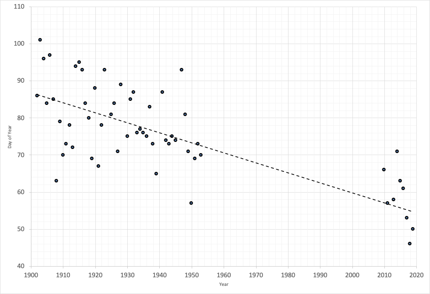 Birders spotted blackbirds much earlier, and in several years a few red-wings were even found during winter. Ross never noted or mentioned any winter records for Red-winged Blackbirds. In 1902, from the data we predict that the spring arrival date was day 86.5. By 2019, our estimate was day 54. Over a span of 117 years, Red-winged Blackbirds appear to be arriving 32.5 days earlier in Bennington County. Of course, this was just a quick examination of one person’s observations in the past to those of many now watching in modern times. Maybe we’re better at detecting them now with more people and better equipment. Or, maybe spring is arriving, on average, a lot earlier. We’ll be digging deeper into the data to learn more.