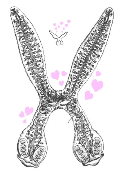 In birds, feathered infidelity might be the norm rather than the exception, but the animal kingdom is not without loyalty. While amorous humans trade gifts and vows of eternal companionship, there’s an aquatic parasite that makes those promises seem… watery. Diplozoon paradoxum clamp themselves to the gills of minnows, then feed off of the minnow’s blood. They’ll continue this monotonous blood-sucking life unchanged until a companion–any companion–clamps on nearby. Once these parasitic flatworms touch, they are wholly committed to life together. Call it love at first bite. Each individual will attach itself to the other with a specialized sucker, at which point the suckers entirely dissolve, leaving the worms permanently fused. Each side then goes about developing the appropriate genitals to reproduce with their better half. There might be plenty of fish in the sea but nothing beats minnow blood for these faithful flatworms.