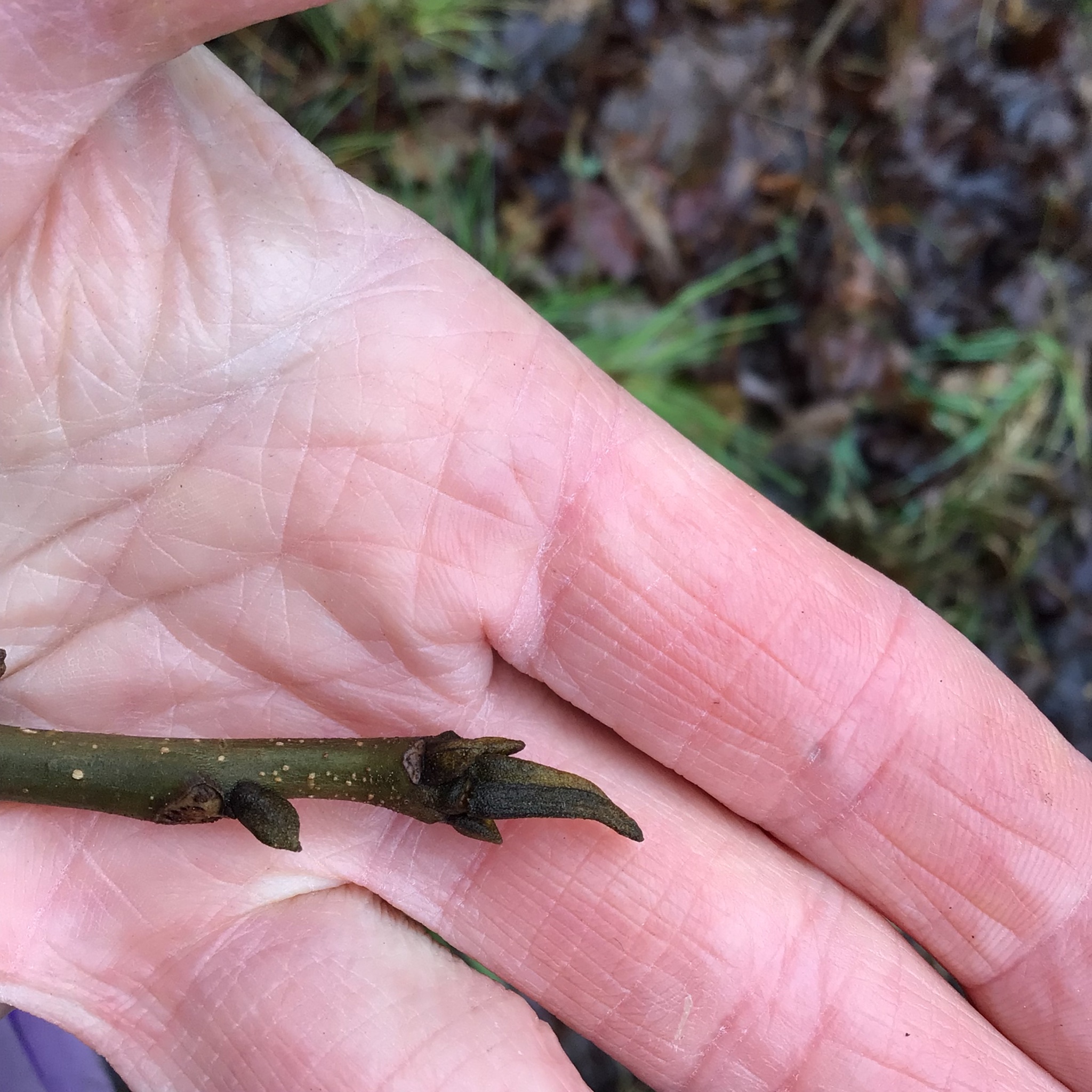 Examining the tree’s buds is the next step towards a correct identification. Buds fall into three general categories: imbricate, valvate, or naked. Imbricate buds, such as those of Red Maple (Acer rubrum) pictured above, have multiple overlapping bud scales. Bud scales are modified leaves that protect the tissues for new growth. Imbricate buds can have a few scales or many scales, depending on the species. Valvate buds have two scales that don’t overlap and resemble praying hands. These bud scales can be smooth (hairless and flat), striated (with tiny ridges), or covered with trichomes (resembling tiny hairs). Naked buds lack scales, such as those belonging to Bitternut Hickory (Carya cordiformis) pictured above. Each bud type comes in many shapes and sizes, differing based on species.