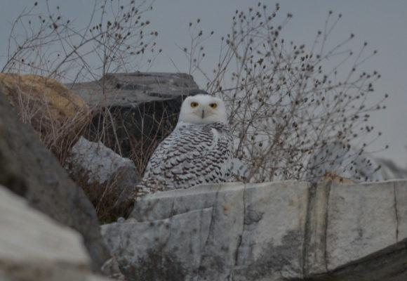 If you find yourself strolling through open fields during a Snowy Owl irruption, bring your binoculars! Fields are a favorite location for these daytime hunters. You can find these owls roosting on fence posts and roofs, or standing on the ground waiting for a tasty small mammal snack to scurry by. They are exceedingly agile and will sometimes catch small birds in the air. These magnificent owls nest on tussocks in the tundra and move south in the winter, depending on food availability in the north. Males are almost pure white while the larger females’ feathers are mottled white and dark brown.