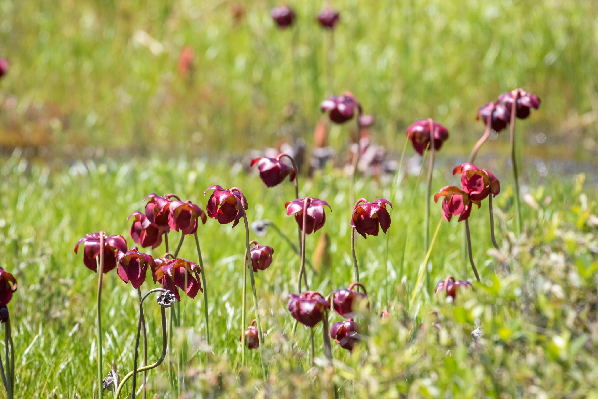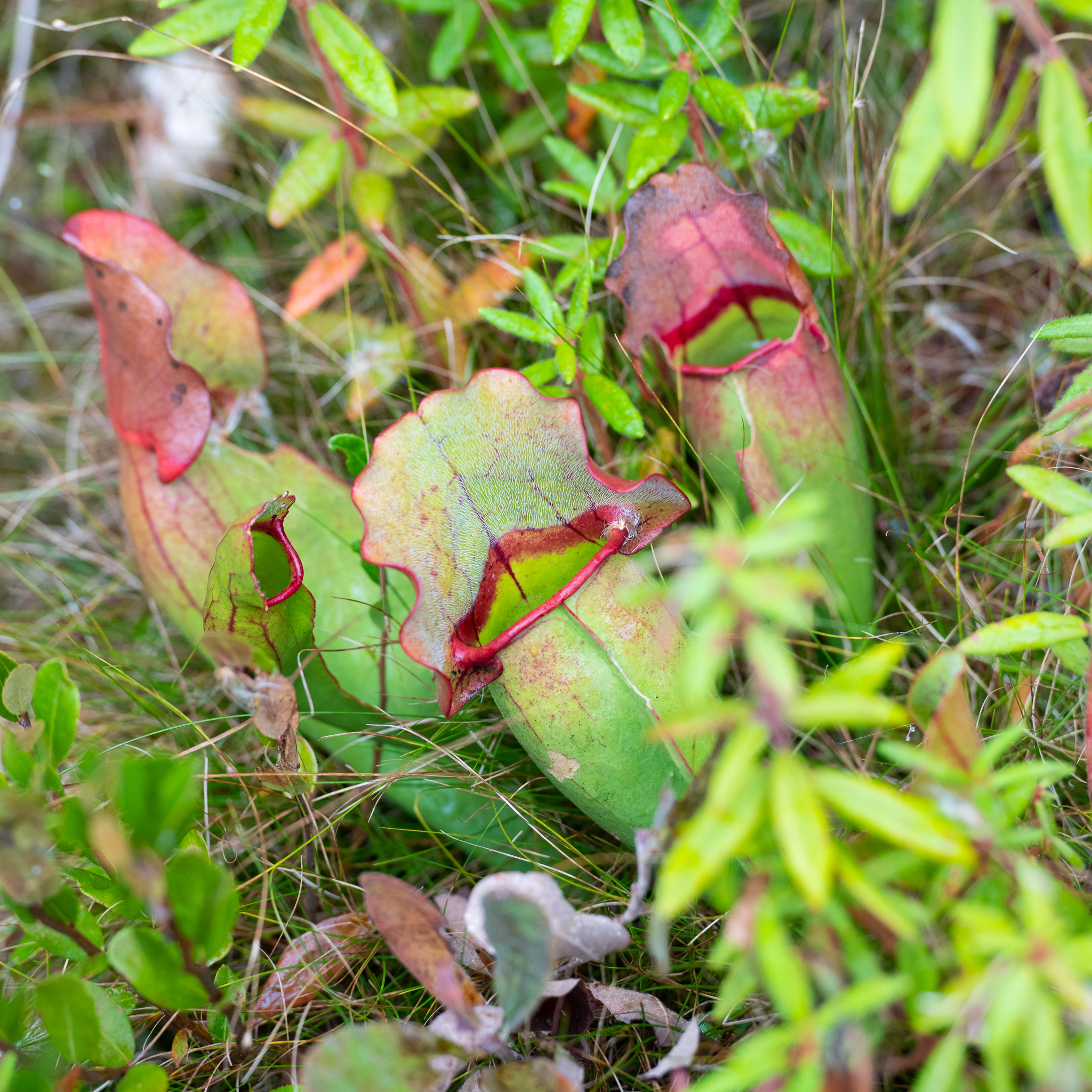 Northern pitcher plants (Sarracenia purpurea) grow as a rosette and produce 6 to 12 new tubular leaves each season. A bunch of pitchers next to each other likely belong to the same individual. New leaves open every few weeks and the “pitcher” that is formed fills with rainwater. Leaves capture the sun for photosynthesis during their first year, but as they age they are used by the plant to capture prey for 1 to 2 years before they fall apart. The small prey die and break down in the pitcher. The plant absorbs nutrients from the prey that are not available from the acidic bog.