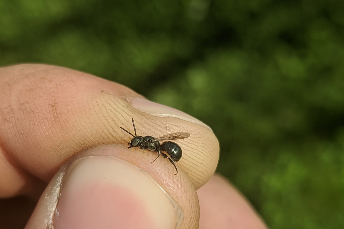 If you live in the Champlain Valley and have untreated wood on your property or have spent time further south in the US, you might be familiar with Large Carpenter Bees (Xylocopa)—they are loud, aggressive, and like to drill holes in houses, barns, and fence posts. Small Carpenter Bees (Ceratina) on the other hand are tiny and unobtrusive but ubiquitous. A large portion of the small dark bees flying right now belong to this group, and although they are small, they have a relatively distinctive shape and can be recognized with practice. The body is a dull metallic blue and relatively hairless and the abdomen is swollen towards the rear unlike other small bees. Males have a horizontal white stripe across the lower portion of the face whereas females usually have a vertical white mark in the middle of the face.