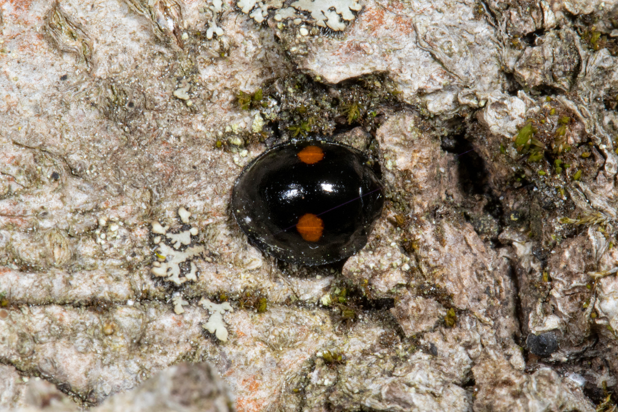 Carefully examine a few beech trunks and you’re likely to find the native Twice-stabbed Lady Beetle (Chilocorus stigma), aptly named for the two bright red spots on each side of its black elytra, feeding on Beech Bark Scale. Here in the north, overwintering adults become active in early spring (April) when mating begins. They lay eggs soon after mating and the larvae emerge in late May. They feed and undergo four instars before pupating. The adults that overwintered will continue to feed through June and early July. Their young mature in early to mid July, and then they mate and lay eggs. Finally, second generation larvae are observed beginning in mid July through early August. These second generation adults emerge in late summer and early fall and overwinter in ground litter.
