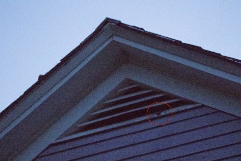 Little Brown Bats begin to emerge from the attic to forage for the night. You can see one slipping out for the night in the red circle. / © K.P. McFarland