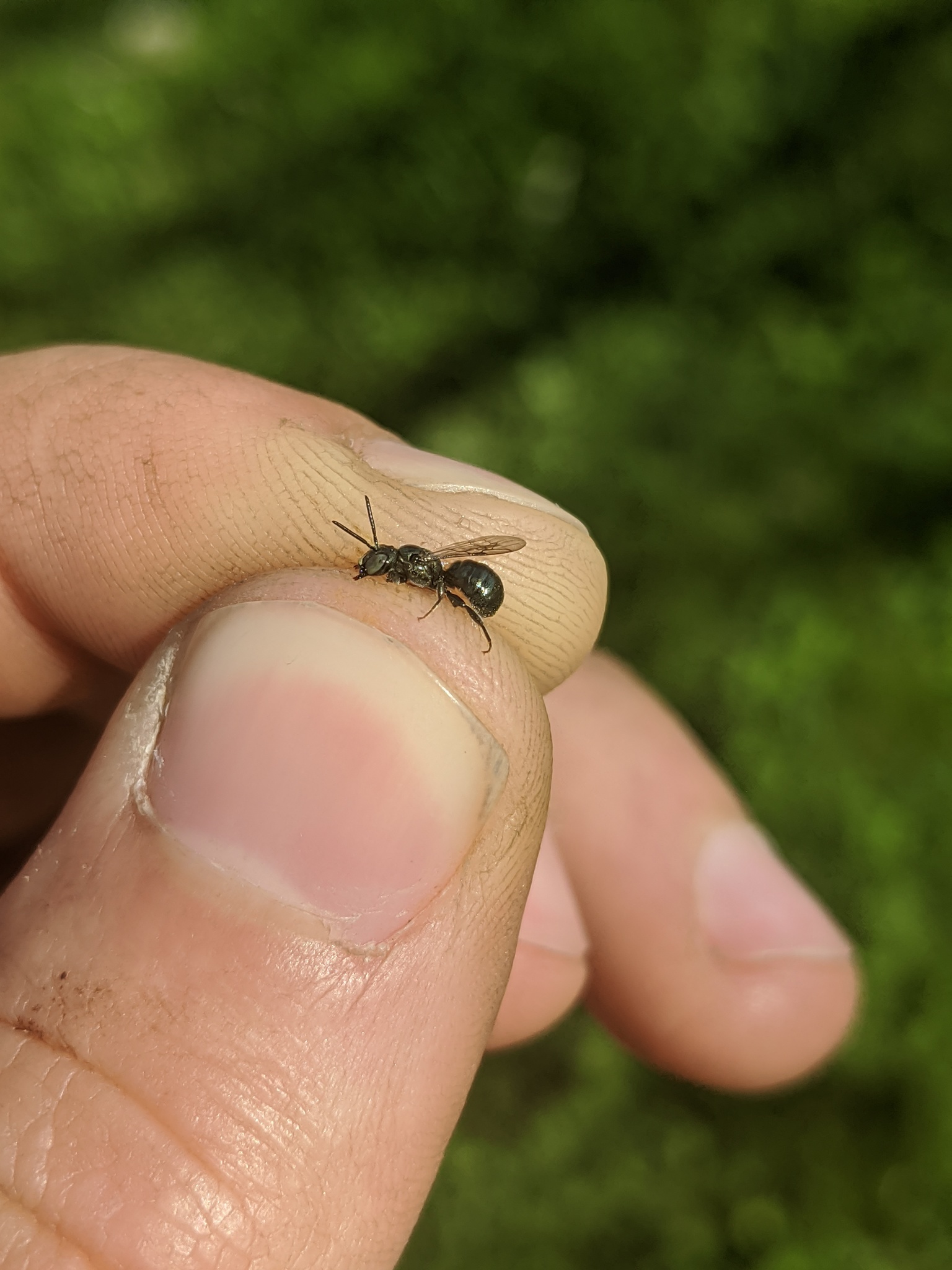 If you live in the Champlain Valley and have untreated wood on your property or have spent time further south in the US, you might be familiar with Large Carpenter Bees (Xylocopa)—they are loud, aggressive, and like to drill holes in houses, barns, and fence posts. Small Carpenter Bees (Ceratina) on the other hand are tiny and unobtrusive but ubiquitous. A large portion of the small dark bees flying right now belong to this group, and although they are small, they have a relatively distinctive shape and can be recognized with practice. The body is a dull metallic blue and relatively hairless and the abdomen is swollen towards the rear unlike other small bees. Males have a horizontal white stripe across the lower portion of the face whereas females usually have a vertical white mark in the middle of the face.
