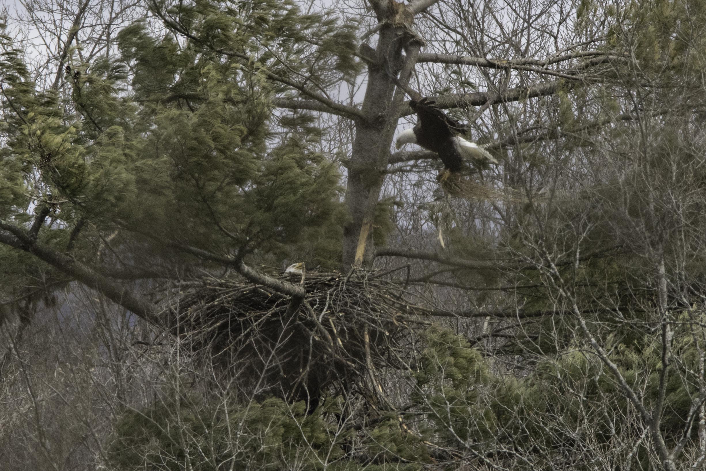 In Vermont, Bald Eagles typically nest in tall trees with broad visibility and sturdy branches near lakes and rivers. Adults show a strong tendency for fidelity to their breeding areas and often use the same nest for many years. The nest tree requires sturdy branches to support the growing weight of the nest as materials are added each year. Nests are usually located approximately 50 to 60 feet high and 5 to 30 feet below the top of a live tree.