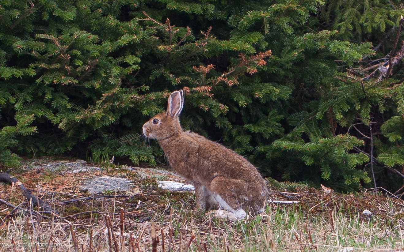 The gestation period for Snowshoe Hares lasts 36 to 37 days, and baby rabbits (known as kits or leverets) are typically born between May and August. Does can produce one to four litters of up to nine kits per year. Interestingly, the number of young that are born may correlate with winter temperatures and the amount of snowfall. As winters continue to warm with less snow accumulation due to climate change, we may see smaller litters being born.