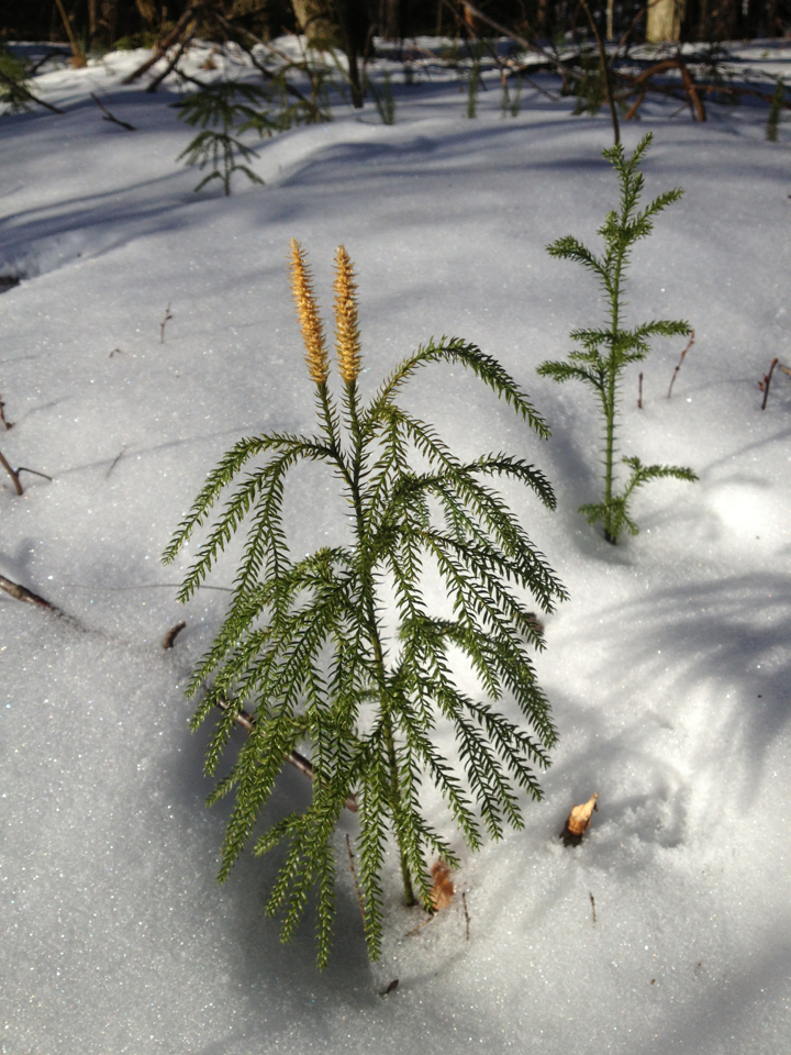 The end of March is a good time to start looking for hardy evergreen plants poking through the snow. Among these winter survivors are tiny forests of ankle-high “pine trees” commonly called “princess pine” or “creeping cedars”. Surprisingly, these lookalikes aren’t related to pine trees at all. They are actually part of an ancient class of plants called clubmosses. In their heyday, they shaded dinosaurs under 100-ft canopies, and when they died they were compressed into coal. Nowadays, these miniature forests spread through horizontal stems that run above or below ground. You can begin to identify common species by their above-ground forms.