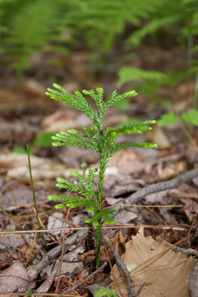 Upright clubmosses stand up straight as a single stem or a stem that splits in two halfway up. The most common species in Vermont are Shining Firmoss and Interrupted Clubmoss.