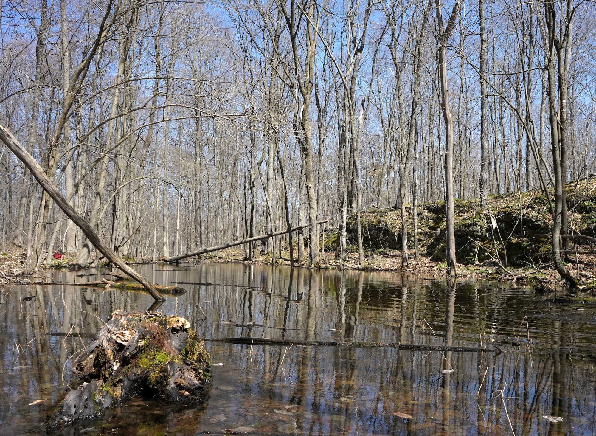 Most vernal pools, small and under a dense forest canopy, have few plants growing within the basin. Instead, vernal pools are defined by the specialist animals that inhabit them, the most widely known being Spotted Salamanders and Wood Frogs. Some more uncommon inhabitants include the Jefferson and Blue-spotted Salamanders, fairy shrimp, and fingernail clams.