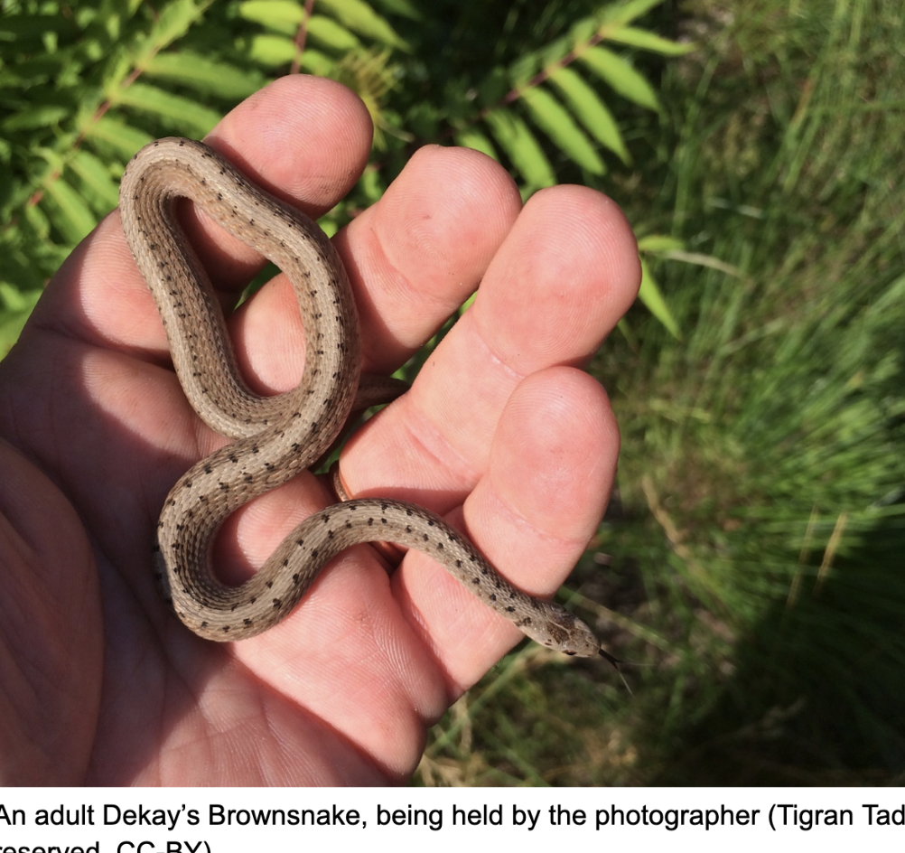 However, ten of Vermont’s eleven species of snakes found are not only essentially harmless to humans, they’re beneficial visitors to your garden, providing a wide range of pest control services. Some snakes snap up mice, rats, and other small mammals, while other species, such as Dekay’s Brownsnake (Storeria dekayi), feed on insects and other invertebrates. Some even specialize in slugs.