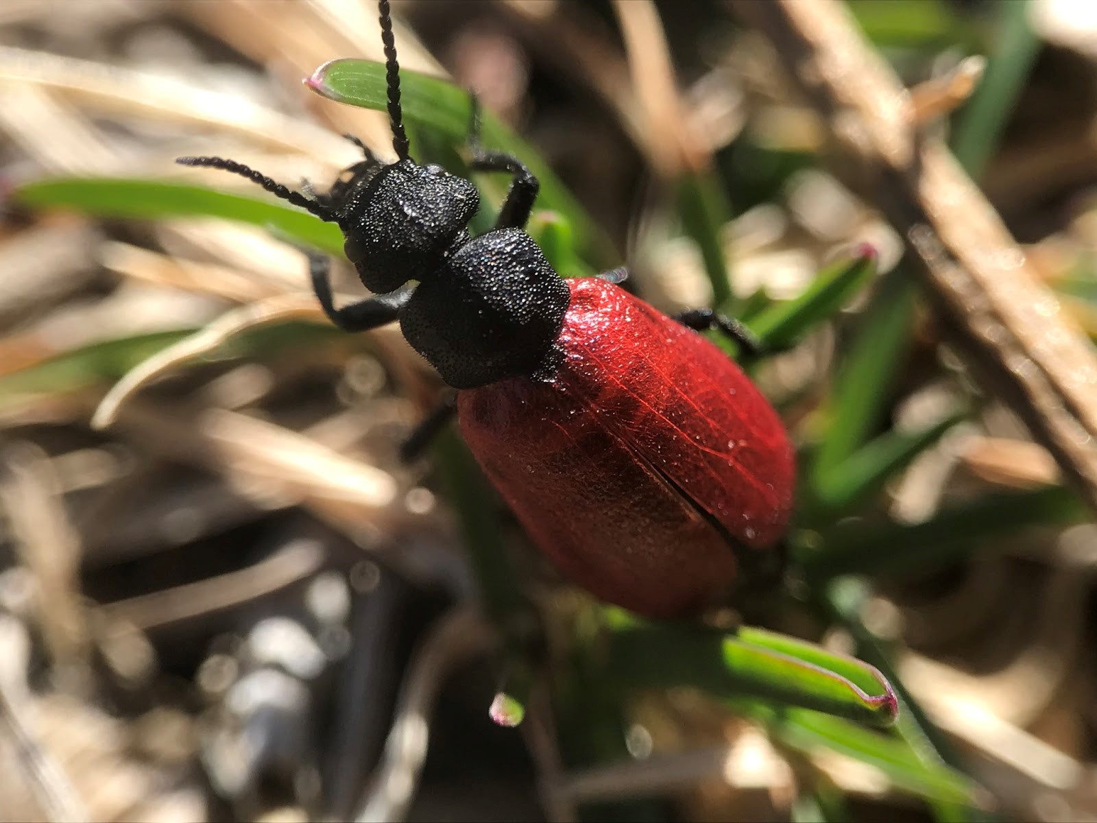 Adults of the blister beetle T. sanguinipennis are flightless and don’t appear to eat. They emerge in spring and quickly mate and lay eggs very close to the tunnel from which they emerged. Come May, those eggs hatch, and vice-mandibled larvae wander about seeking a hairy bee to clamp on to. Excellent natural history observations from a century ago details their journey. These beetles overwinter underground, using their clamp-like jaws to hitch a ride on a female bee before it burrows and builds subterranean nest chambers. You might find these hitchhikers on male bees as well, but their attachment pattern is different: on males, T. sanguinipennis larvae might be anywhere on the abdomen, but on females, larvae are almost always found on top. The larvae seem to clamp on to whatever bee they encounter first, then, if they happen to be riding a male, transfer to the back of a female when the two bees mate.