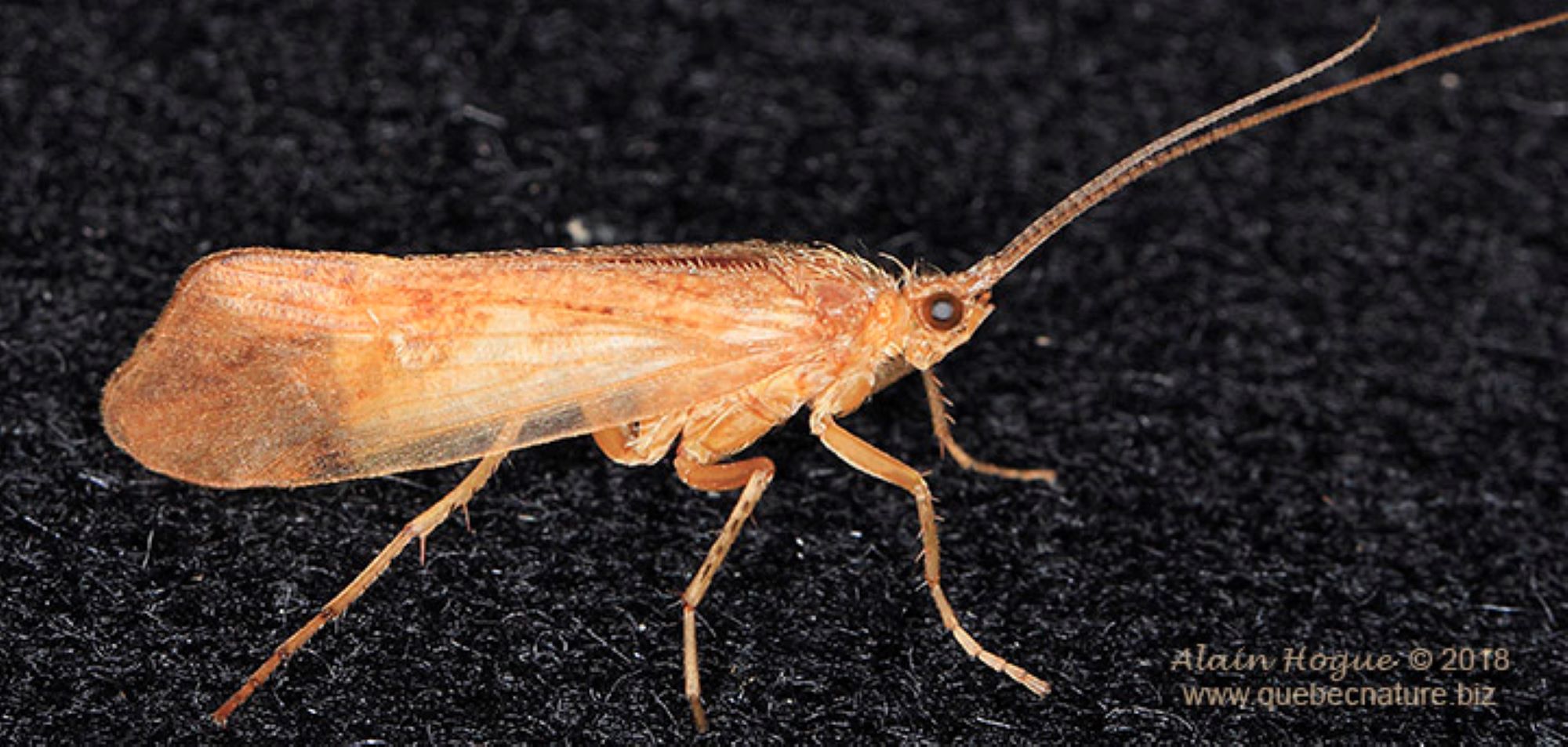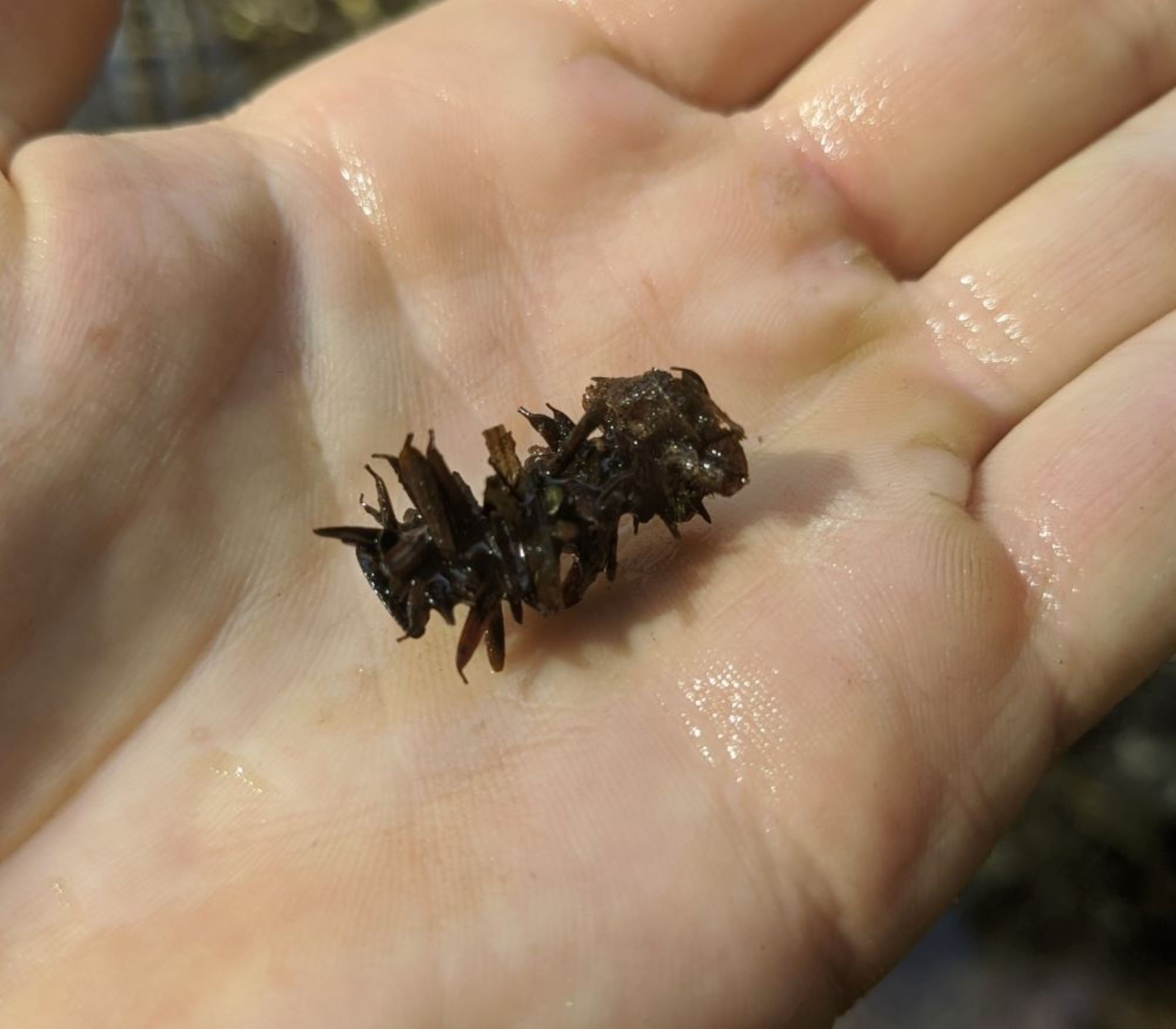 Caddisflies (Order Trichoptera) are small insects that resemble a moth or butterfly in their adult stage. However, most of this species’ life cycle will be spent as larvae, resembling small grubs with legs. Most Caddisfly larvae make little mobile homes (casings) that they use in a comparable way to the way that Hermit Crabs use shells. Other Caddisfly species build stationary casings that they venture out from to forage. Caddisfly casings can be made out of vegetation, sand, mud, twigs, or other materials, and are spun together using silk. A group of Caddisflies in the Limnephilidae family make their casings in an alternating perpendicular pattern, yielding the common name “Log-cabin Caddisflies.” These homes are built with specific materials based on species.