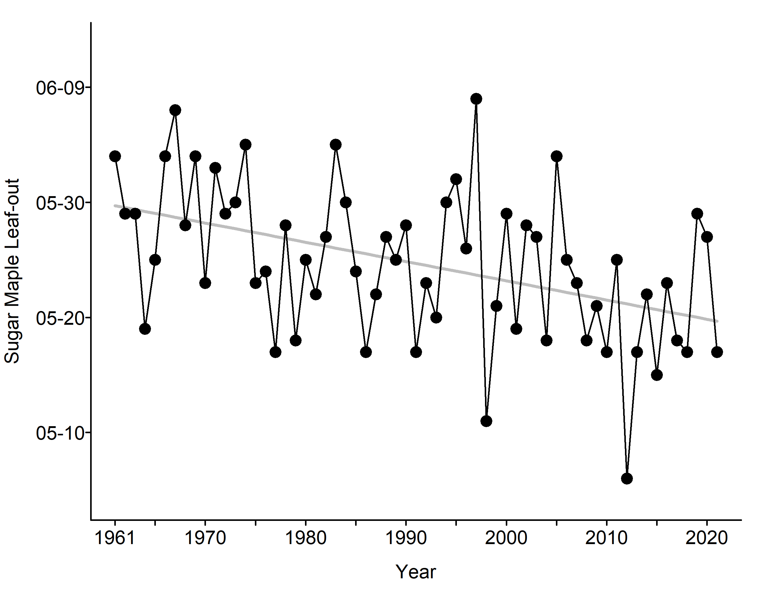 territory for breeding songbirds. The Black-throated Blue Warbler, for example, uses Sugar Maple leaf-out to help time when to start breeding. Long-term research from Hubbard Brook Experimental Forest in New Hampshire has found breeding pairs’ time egg-laying to coincide with leaf-out. Nesting pairs that lay their eggs as the leaves expand produce more young than those that initiate egg-laying before or after leaf-out.