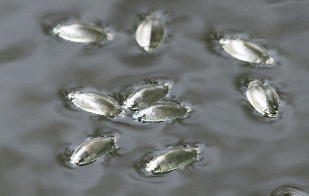 If you have ever seen whirligig beetles, I imagine you have noticed how quickly they can move when approached. You will also most likely have observed them in groups rather than as individuals on their own. These behaviors are strategic—the rapid spiraling patterns confuse potential predators while living in groups reduces an individual’s risk of getting eaten. However, these are not the only strategies that whirligig beetles utilize. These beetles actually have four eyes, with two positioned above and two below the water’s surface, allowing them to watch for predators on either side. They are also countershaded—dark against the dark background of the water from above and light against the light sky from below. If that isn’t enough protection, the beetles release a noxious chemical when eaten, which stops most predators from trying to eat another whirligig beetle in the future.