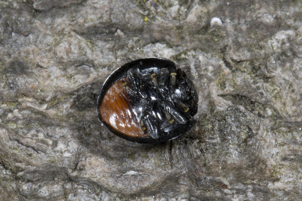 As soon as the snow has departed from forest floors and there have been a few consecutive days around 50 degrees F, you will likely see tiny black spots trundling along American Beech (Fagus grandifolia) trunks speckled with white fuzz. The white fuzz is actually a tiny insect, the Beech Scale Insect (Cryptococcus fagisuga), which introduces a canker-causing Neonectria fungus, leading to beech bark disease. The mobile black spots are Twice-stabbed Lady Beetles (Chilocorus stigma), a native lady beetle (also called ladybug) known to combat beech bark disease by feasting on Beech Scale Insects.