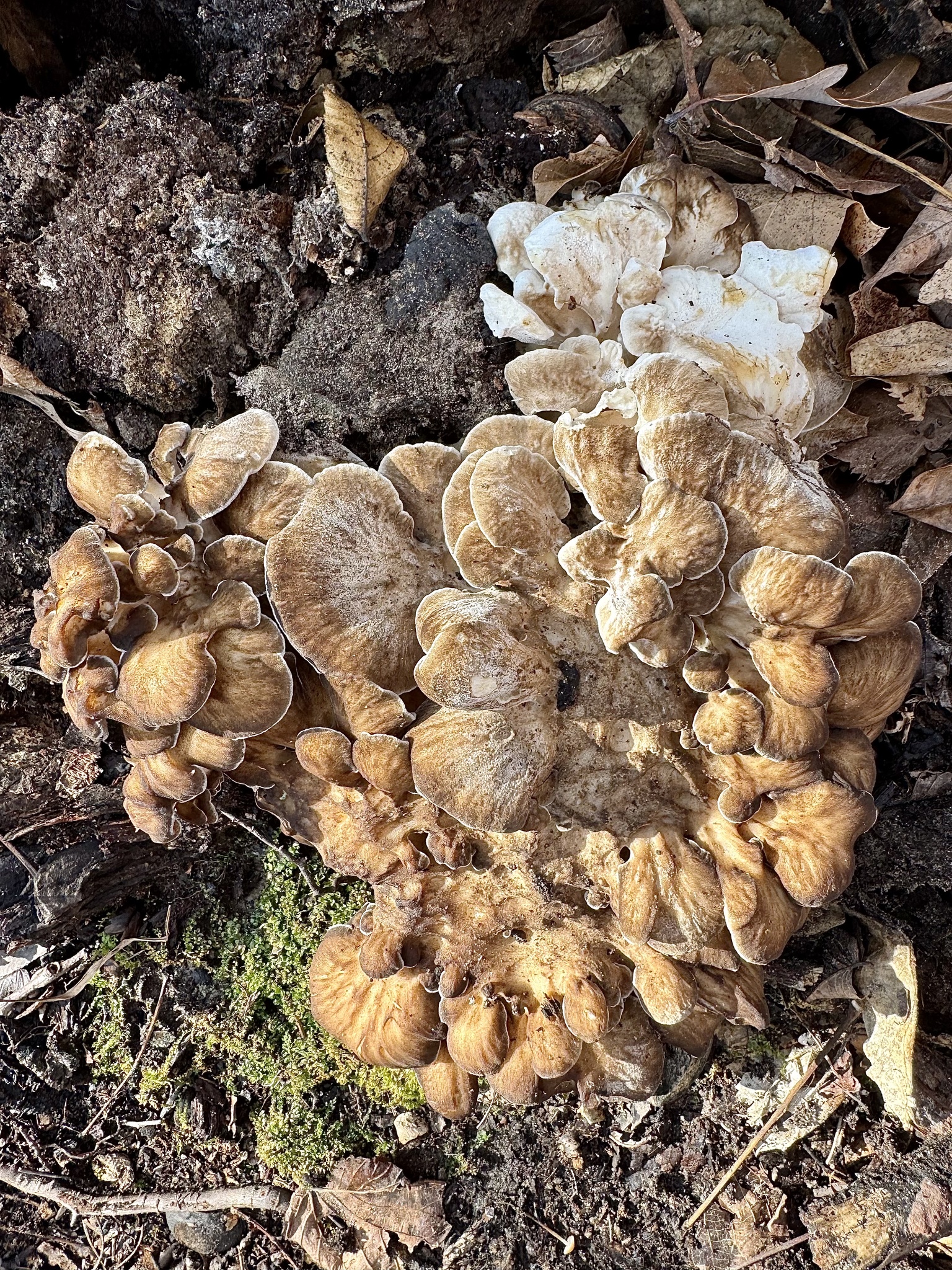 Hen of the Woods (Grifola frondosa), a choice edible species of polypore, is weakly parasitic on oak and maple. Look for them around the base of these trees from September until hard frost. If you find a “hen tree,” note its location because it can produce several mushrooms per season for many years. The shaggy light brown fruiting bodies, resembling a rather rumpled bird, are made up of whorls of spoon-shaped rosettes arising from a thick, white base. Hen of the Woods are impressively large mushrooms, typically 12–20 in. wide and weighing 10–15 lbs. Some gargantuan specimens can reach epic proportions—as large as 40 in. across and weighing up to 50 lbs!