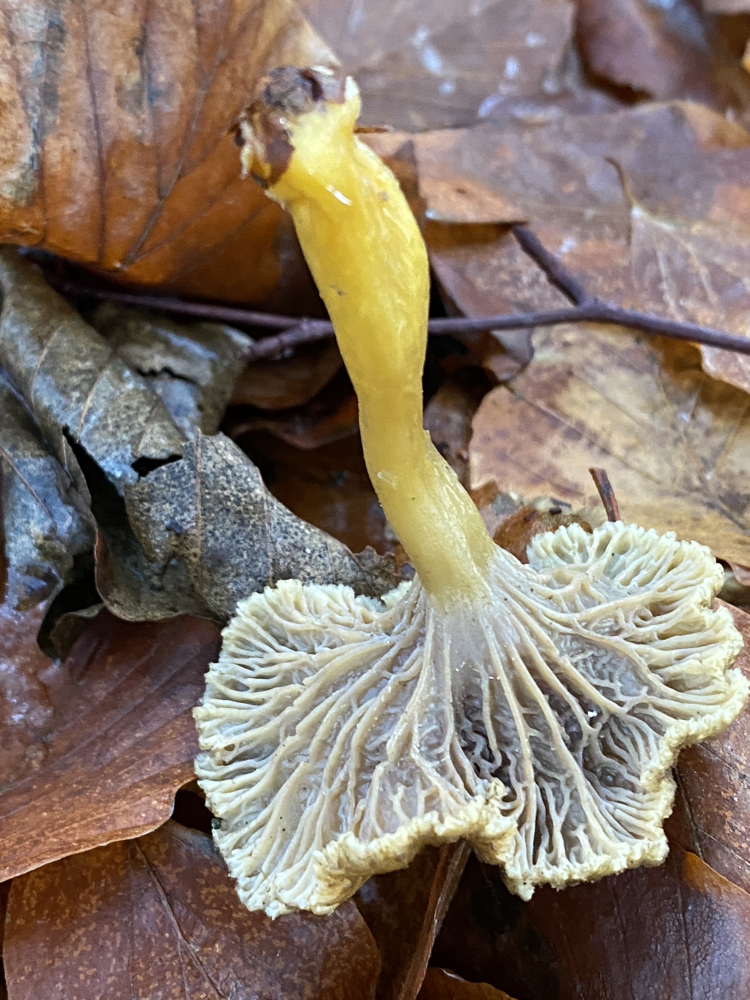 Yellowfoot Chanterelles (Craterellus tubaeformis) really shine at this time of year. Also known simply as “winter mushrooms” due to their habit of fruiting late into the season, they are not true chanterelles but are more closely related to Black Trumpets (Craterellus fallax in the Northeast). These fungi are usually no more than 2–3 in. high. Their delicate fruiting bodies feature dull yellow to brown funnel-shaped caps and false gills—a series of forked ridges and folds that do not detach easily from the cap or stem—which run partially down their bright yellow, hollow stems. Mycorrhizal with conifers, including Eastern Hemlock, Yellowfoot Chanterelles can be found fruiting in cheerful clusters among moss and well-decayed woody debris in consistently moist, shady nooks.