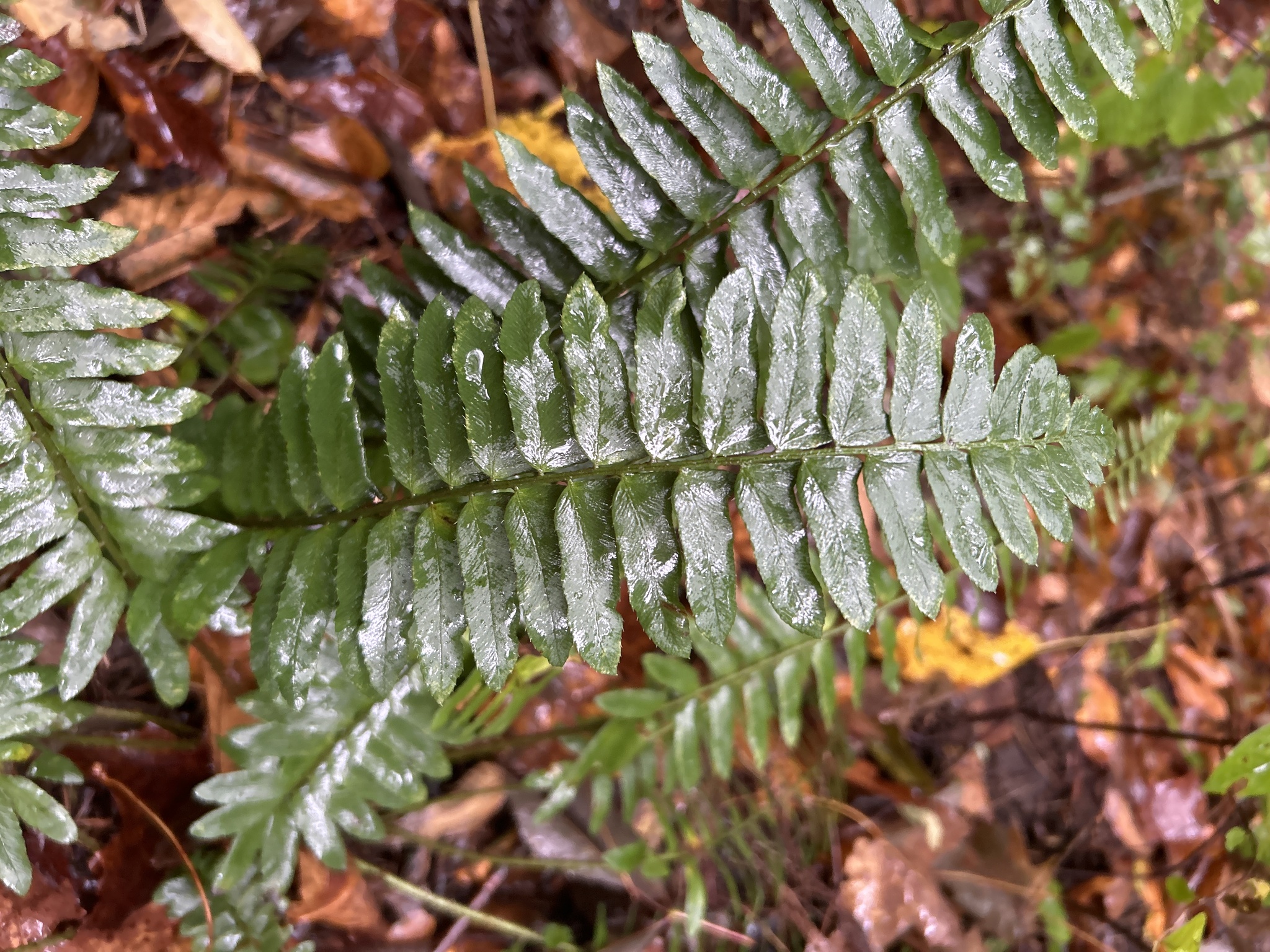 The evergreen ferns are leathery enough to photosynthesize throughout winter. The widespread Christmas Fern (Polystichum acrostichoides) has been gathered as holiday greens by European settlers and used for various medicines by Indigenous peoples. It’s also on the late winter menu for hungry grouse and deer. The fronds are dimorphic (either sterile or fertile), and the individual pinnae look somewhat like stockings hung by the chimney. Fertile fronds grow on the ends of the evergreen sterile fronds. Smaller and somewhat shriveled up by November, the backs of these fertile pinnae are covered with brown sori.
