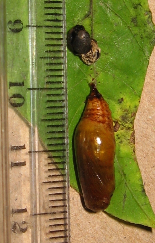 You can look even closer to home for less picky species. Search under the handrail on your porch for the tucked-away white or brown pupa of a Cabbage White (Pieris rapae). Or investigate curiously curled leaves in your potted plants for the camouflaged leaf-like pupa of a Silver-spotted Skipper (Epargyreus clarus).