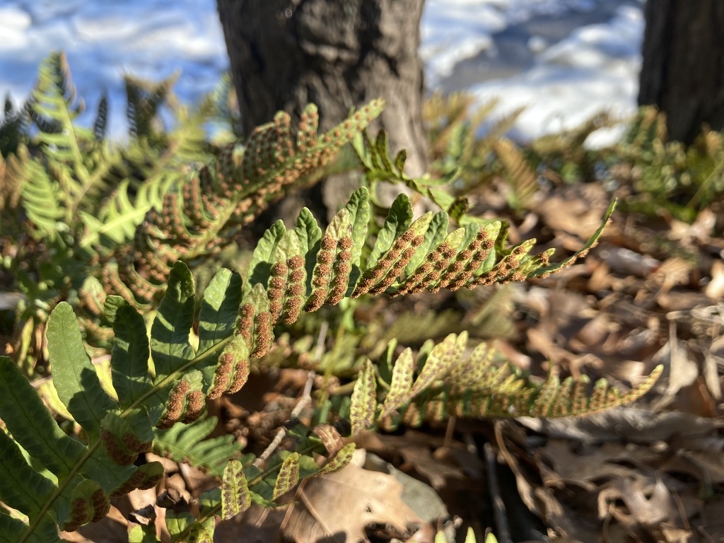 Forests blessed with acidic boulders enjoy Polypodium virginianum, or Rock Polypody. Growing on the tops of boulders, they often resemble mops of hair. The little evergreen fern is made even more eye-catching by the round puffy orange sori on the backs of the pinnae.