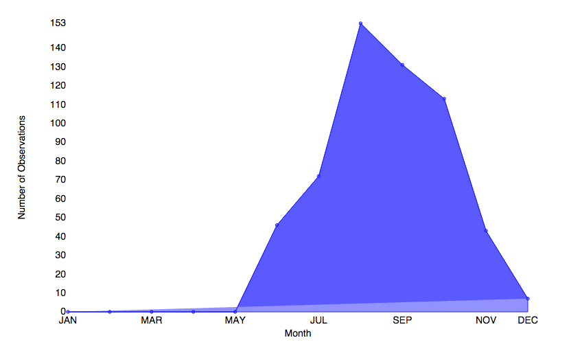 Clouded Sulphur flight season in Vermont from e-Butterfly.org data. Some are found in the Champlain Valley as late as early December.