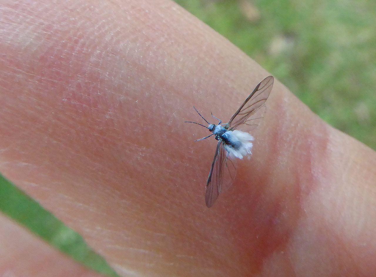 Those tiny tufts of powder-blue lint floating, well, like floaters in your field of view, aren’t outcasts from the dryer cycle. They’re hearty November insects, the adult form of a wooly aphid species. We more often see these aphids gathered in a mass on speckled alder, sucking liquids and covered with a waxy white coating resembling cotton or wool (like the image here). But the adult stage (the blue-lint form) is now on the wing. Bryan’s partner Ruth calls them “Blue Fuzzy-Butts.” Bryan reports on his blog.