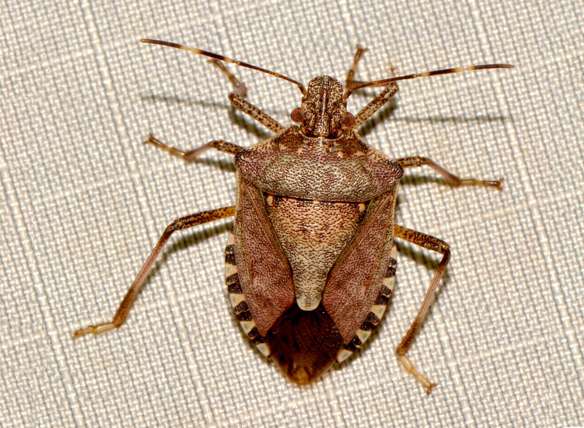Brown Marmorated Stink Bugs (family Pentatomidae) were accidentally introduced to Pennsylvania in the 1990s from their native range in east Asia. Without native parasites and parasitoids, their populations have rapidly expanded to envelop most of the U.S, where they have become a serious pest of stone fruits, apples, citrus, beans, and corn, to name a few. These marmorated (meaning “marbled”) bugs reduce the marketability of fruits by inserting their proboscis under the skin and injecting chemicals that soften and brown the flesh upon which they feed. When the weather cools, the bugs move into our homes to spend the winter. They resemble many of our native 50+ species of pentatomid (stink bugs), but their banded antennae are distinctive, and our native pentatomids generally spend the winter under the leaf litter instead of in your home. You’ll find Brown Marmorated Stink Bugs alone or in large groups, atop walls, along windows, or resting near a warm lightbulb. They are easily and safely moved outside but emit a long-lasting foul-smelling defensive chemical if crushed or vacuumed. You may be tempted to find and remove these unwanted guests before they show up on your guest’s water glass at dinner. But not to worry – they seem to have a habitat of finding you.