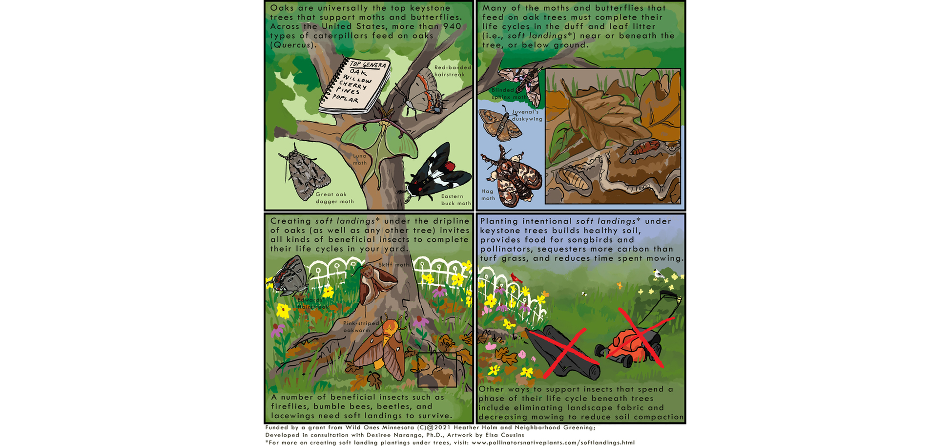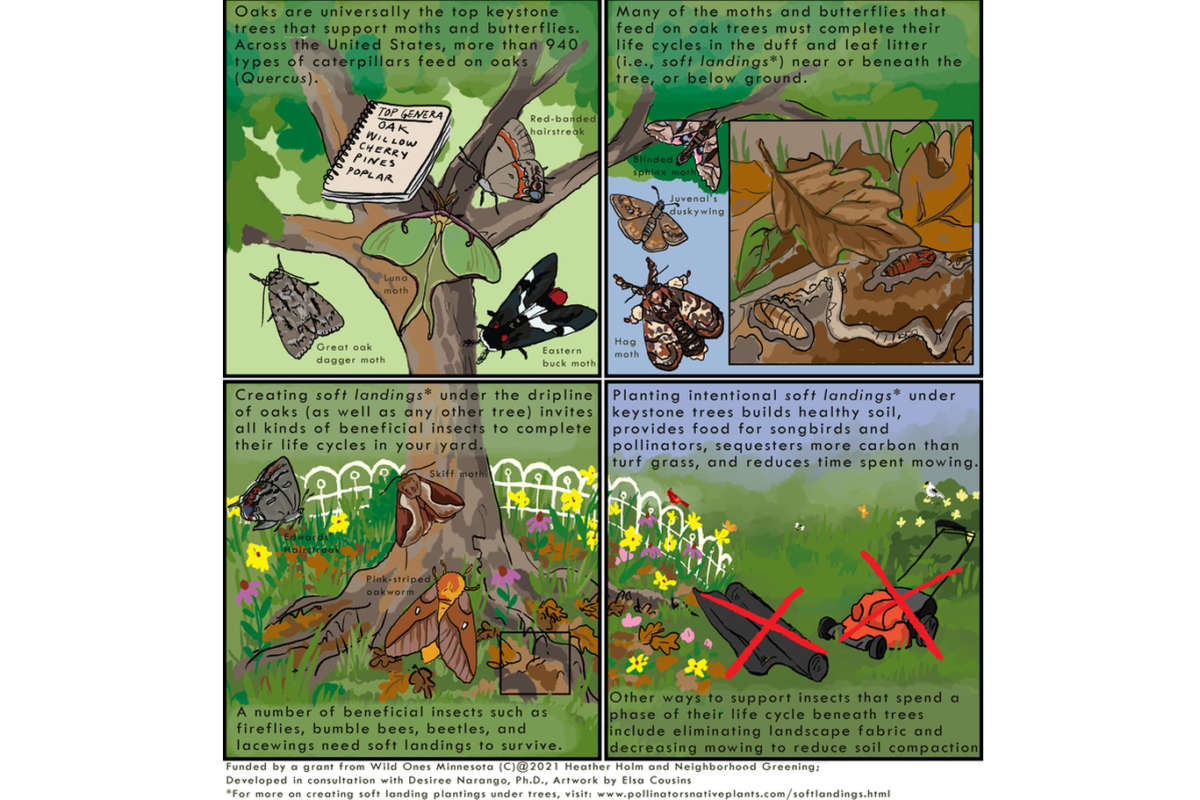 One of the most valuable actions you can take at home is not to do anything! To learn more about soft landings, check out the soft landings comic and visit Heather Holm’s website for more info and planting suggestions: https://www.pollinatorsnativeplants.com/softlandings.html.