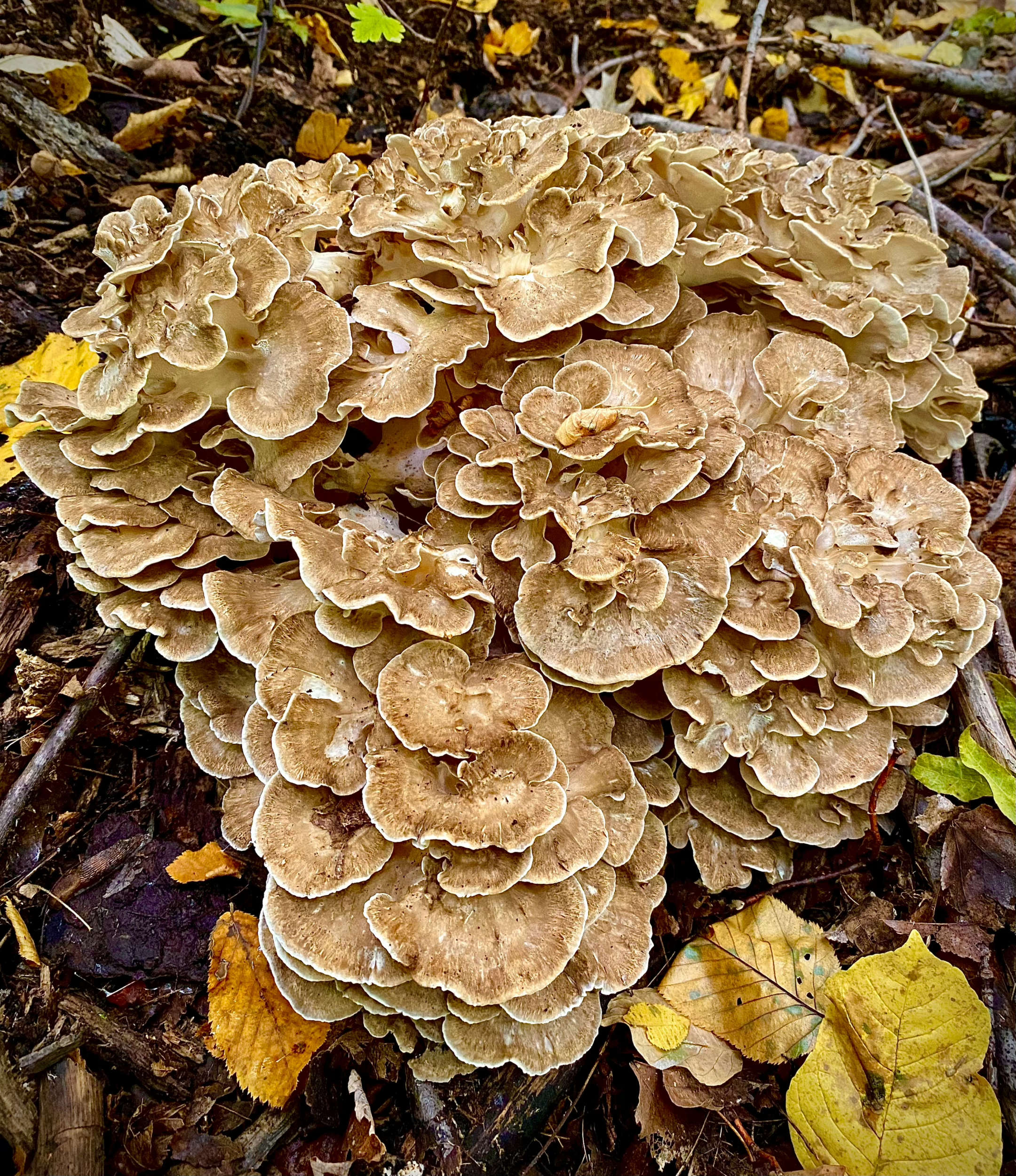 Hen of the Woods (Grifola frondosa), a choice edible species of polypore, is weakly parasitic on oak and maple. Look for them around the base of these trees from September until hard frost. If you find a “hen tree,” note its location because it can produce several mushrooms per season for many years. The shaggy light brown fruiting bodies, resembling a rather rumpled bird, are made up of whorls of spoon-shaped rosettes arising from a thick, white base. Hen of the Woods are impressively large mushrooms, typically 12–20 in (30–50 cm) wide and weighing 10–15 lbs (4.5–7 kg). Some gargantuan specimens can reach epic proportions—as large as 40 in (100 cm) across and weighing up to 50 lbs (22 kg)!