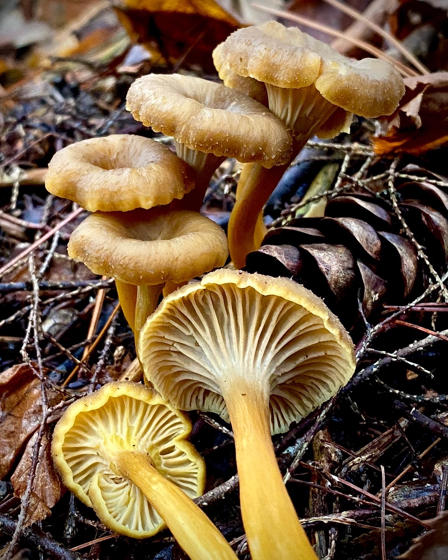 Yellowfoot Chanterelles (Craterellus tubaeformis) really shine this time of year. Also known simply as “winter mushrooms” due to their habit of fruiting late into the season, they are not true chanterelles but are more closely related to Black Trumpets (Craterellus fallax in the Northeast). These fungi are usually no more than 2–3 in (5–8 cm) high. Their delicate fruiting bodies feature dull yellow to brown funnel-shaped caps and false gills—a series of forked ridges and folds that do not detach easily from the cap or stem—which run partially down their bright yellow, hollow stems. Mycorrhizal with conifers, including Eastern Hemlock, Yellowfoot Chanterelles can be found fruiting in cheerful clusters amongst moss and well-decayed woody debris in consistently moist, shady nooks.
