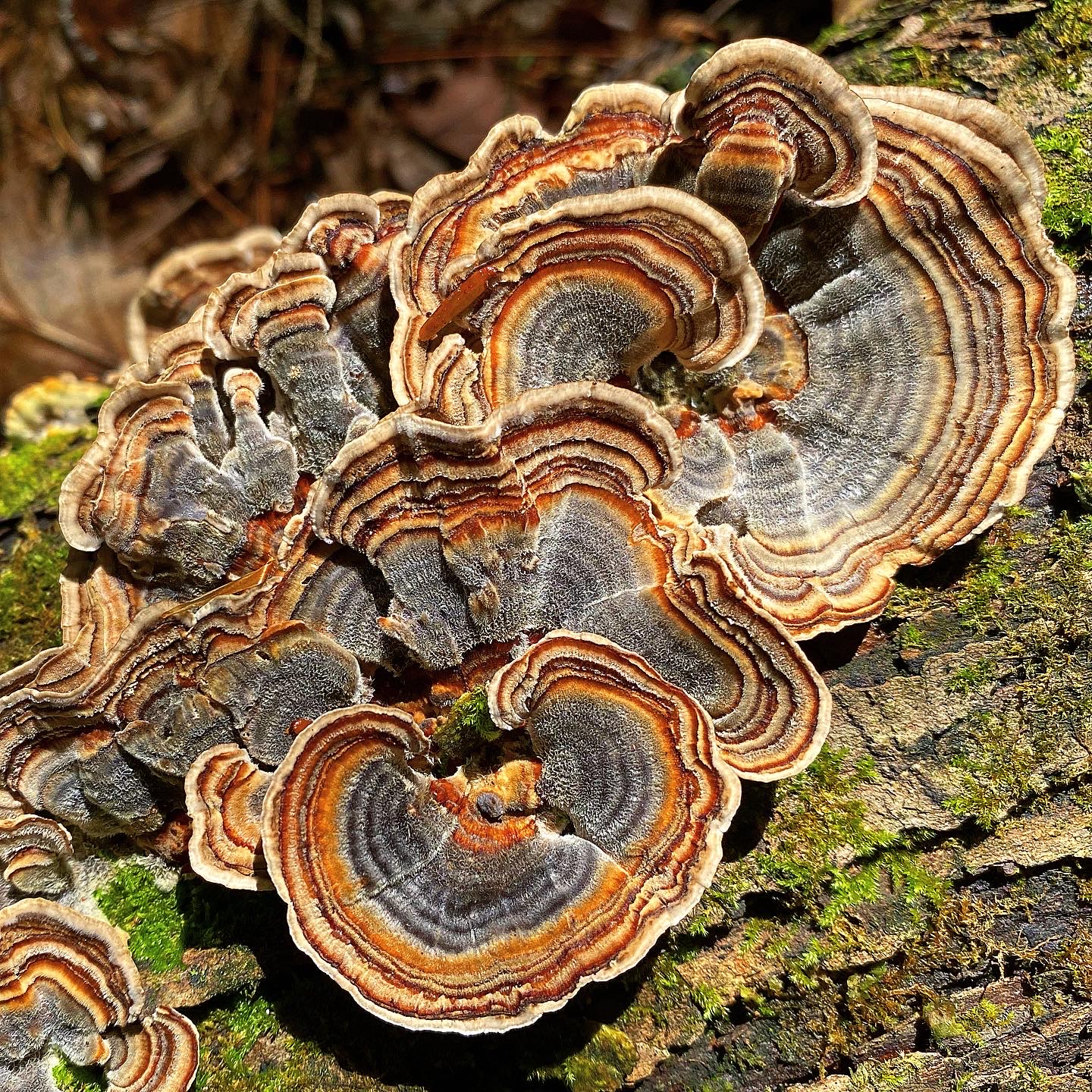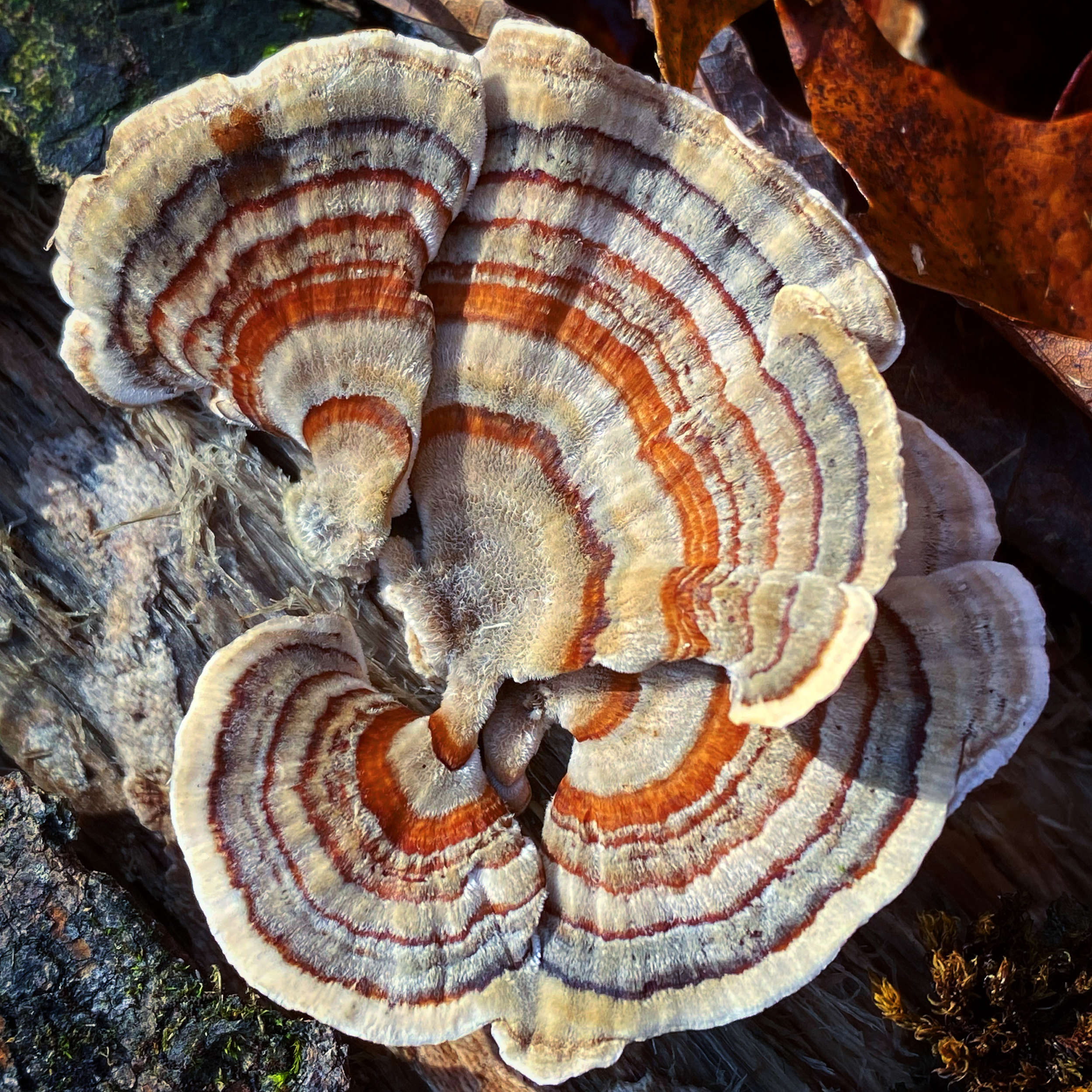 Late autumn’s thick layer of fallen leaves can obscure many ground-dwelling mushrooms, making them difficult to find. Wood-inhabiting fungi, elevated above the leaf litter, can be easier to spot. Gorgeous Turkey Tail Mushrooms (Trametes versicolor), whose fruiting bodies resemble the fanned-out plumage of a strutting wild tom turkey, grow in overlapping clusters and rosettes on decaying hardwood stumps and logs. It is uncommon for one species of mushroom to display a wide range of color variations, but Turkey Tails do just that. Their species name, versicolor, actually means ‘of several colors’ and perfectly describes the vast array of hues—shades of brown, grey, lavender, and even blue—arranged in concentric bands on the mushroom’s caps. These fungi can occasionally persist year-round, and algae may colonize older specimens and tint them green. As key members of nature’s recycling crew, decomposers such as Turkey Tails play an essential role in the forest ecosystem by breaking down wood and other organic matter and releasing nutrients back into the environment where other organisms can utilize them.