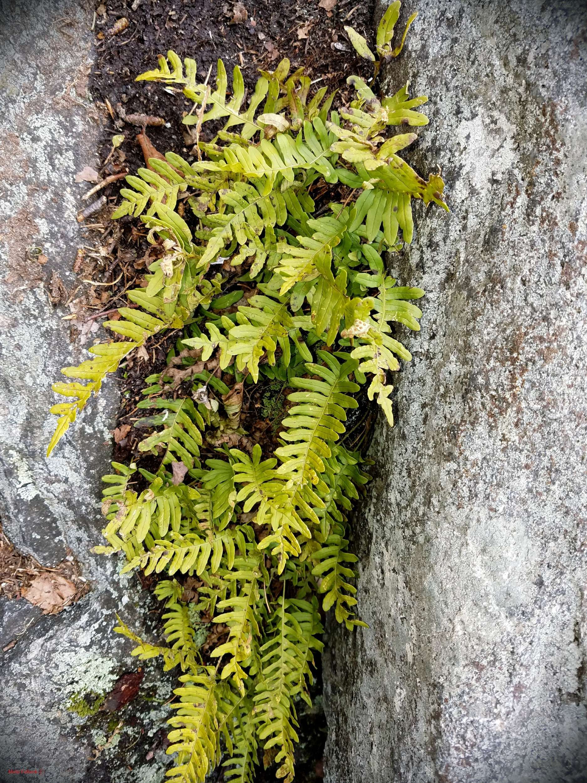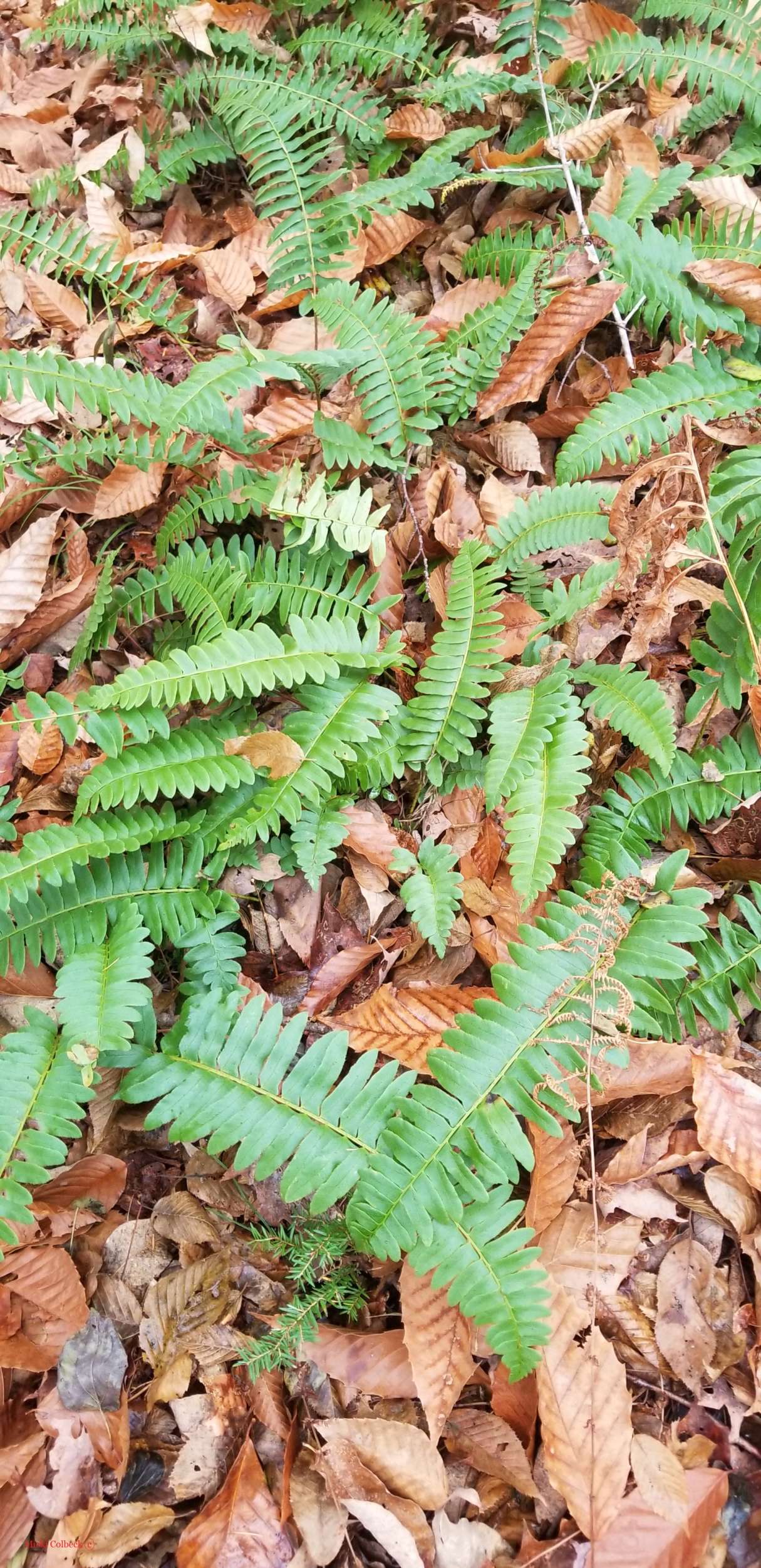 Forests blessed with acidic boulders enjoy Polypodium virginianum, or Rock Polypody. Growing on the tops of boulders, they often resemble mops of hair. The little evergreen fern is made even more eye-catching by the round puffy orange sori on the backs of the pinnae.
